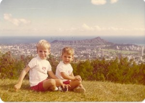By the way, I am convinced that my brother and I are celebrities in Japan. Hawaii is teeming with Japanese tourists, you see, and these camera-toting strangers were forever asking my parents if they could take our picture. Because we were just so gosh-darned cute, I suppose! And also, we had blonde hair, which is definitely not common in Japan. Plus, my parents had this annoying habit of dressing us alike, so people were always thinking we were twins. Even though there was a two-year age difference. Oh, those wacky Japanese. We were a novelty to them, and to this day we joke about the fact that, in photo albums all over Japan, there are pictures of these identically-dressed blonde boys from Hawaii. If I’m ever in Tokyo and some stranger points me out in a crowd and says he knows me, well, I guess I’ll have a pretty good inkling why.