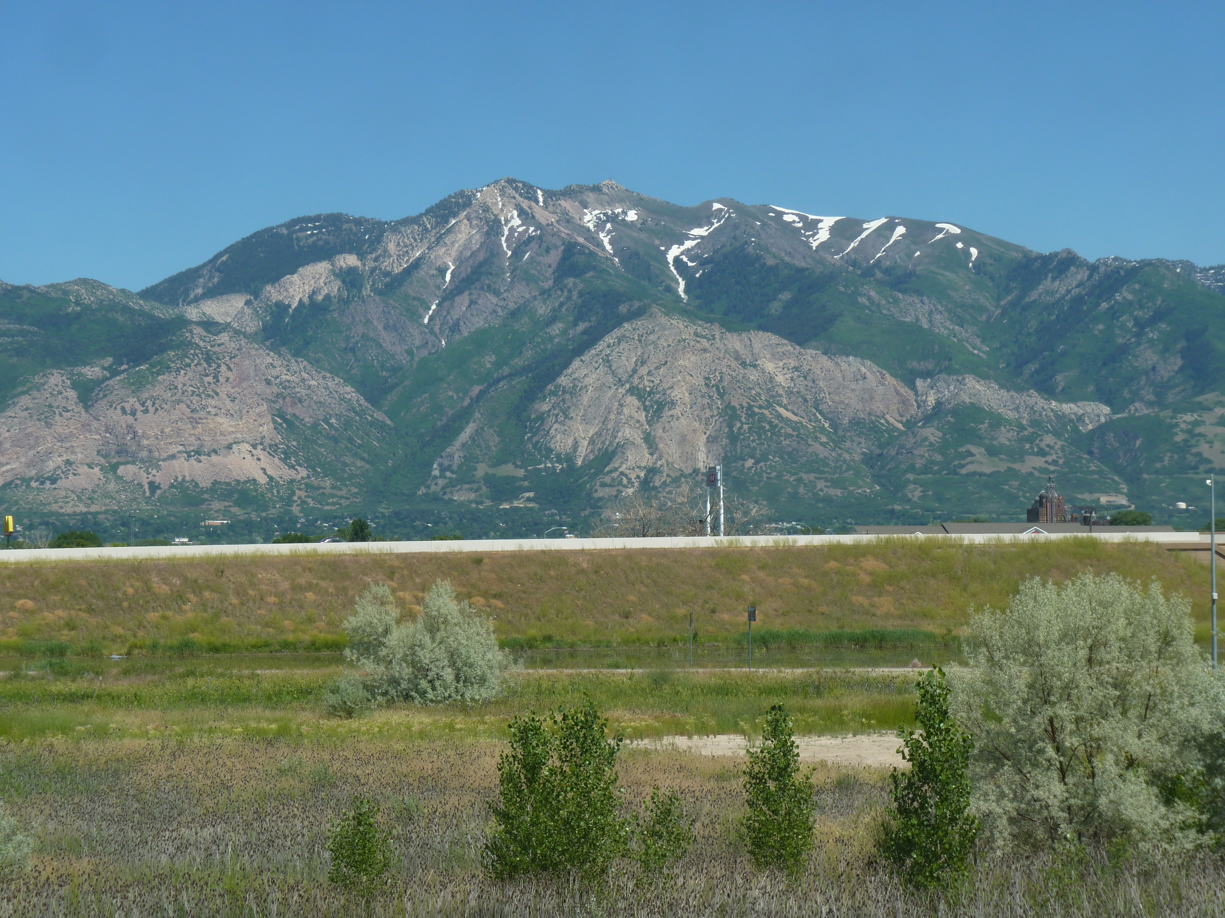 Most of the time, crossing into a new state yields no discernible difference. Indiana looks remarkably like Illinois, Ohio looks remarkably like Indiana, etc. But the moment I passed the Utah border, the landscape changed. The high desert of Wyoming gave way to steeper, greener mountains and canyons in Utah. I passed through the Wasatch Front mountain range, their peaks still dusted with snow, and gasped out loud, the scenery was so beautiful. Utah – at least this portion – is gorgeous! It’s also hot as blazes. The temperature when I arrived in Ogden was 99 degrees. Ouch.