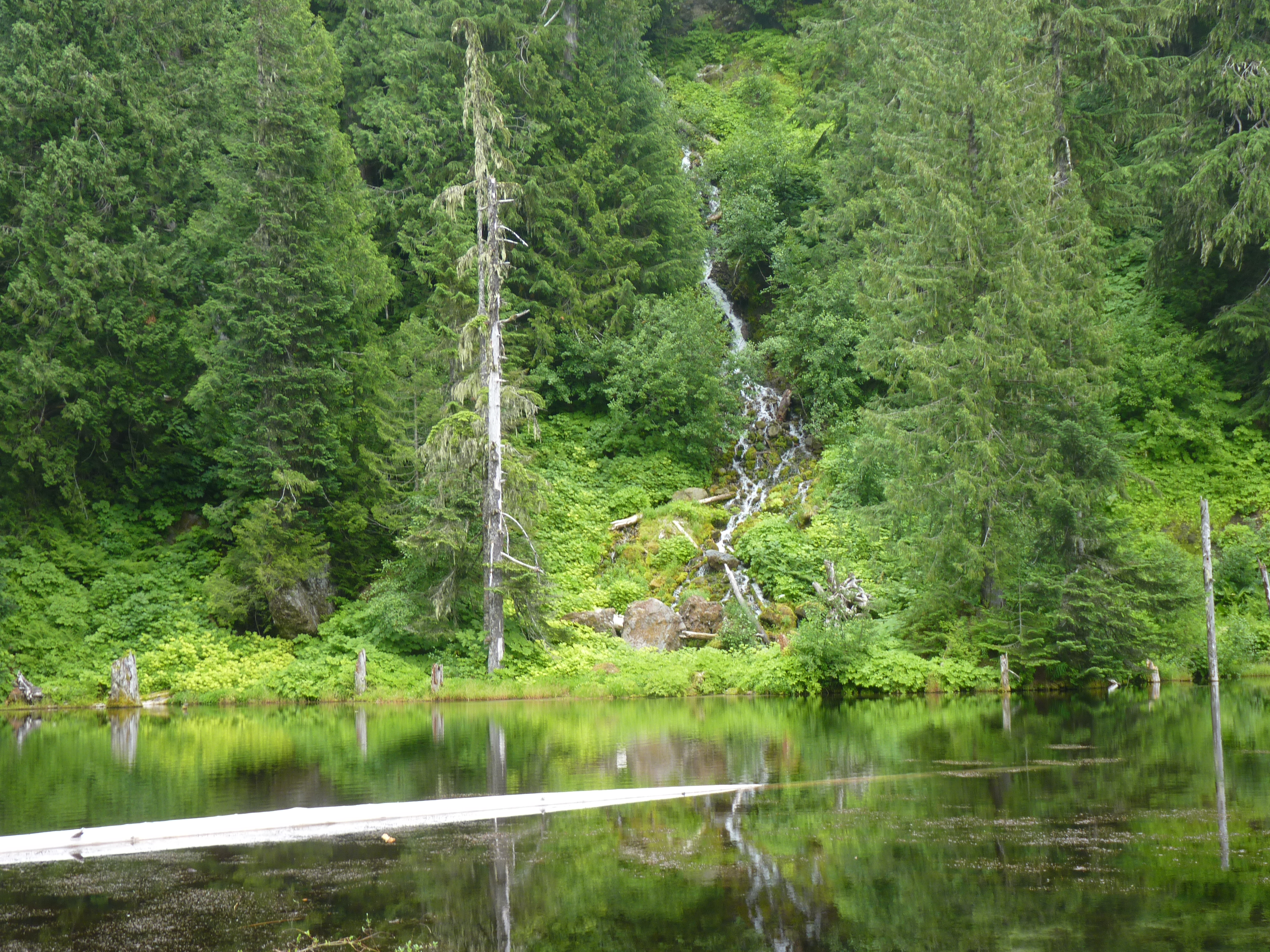 We stopped for a picnic lunch at Beaver Bay, a nice little spot situated on the banks of Yale Lake. The sky was overcast, a stiff breeze was blowing off the lake, and we shivered beneath sweatshirts and jackets while eating our sandwiches. This may yet go down as The Summer That Wasn’t, I’m telling you. “It’s just the wind on the lake,” I told him optimistically, but when we arrived at the trailhead – 2700 feet in elevation – the air was every bit as cold. My dad said it felt like we were hiking in an air-conditioned room, and that was a pretty accurate description. The sky remained gray with clouds obscuring the tops of the trees, and the temperature couldn’t have been warmer than about 58. Regardless, it was beautiful, even if the hike to June Lake is all uphill and gains 700 feet. I have hiked many times when it was sunny and 85, and I would much rather have a cool, cloudy hike.
