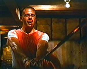 Really peeved now, the stepdad ran inside the house and grabbed a machete. That’s right, one of those long, sharp swords that are useful for cutting trails through the rainforest. What, you don’t have one stashed away in the hall closet? Haven’t you ever heard the saying “it’s a jungle out there?” Reminds me of that scene in Pulp Fiction where Bruce Willis is choosing a weapon to deal with his Deliverance-style attackers and settles on the machete. Sort of a case of life imitating art right here in P-Town! The boys, staring down the business end of a very wicked blade, decided to fight back with weapons of their own.