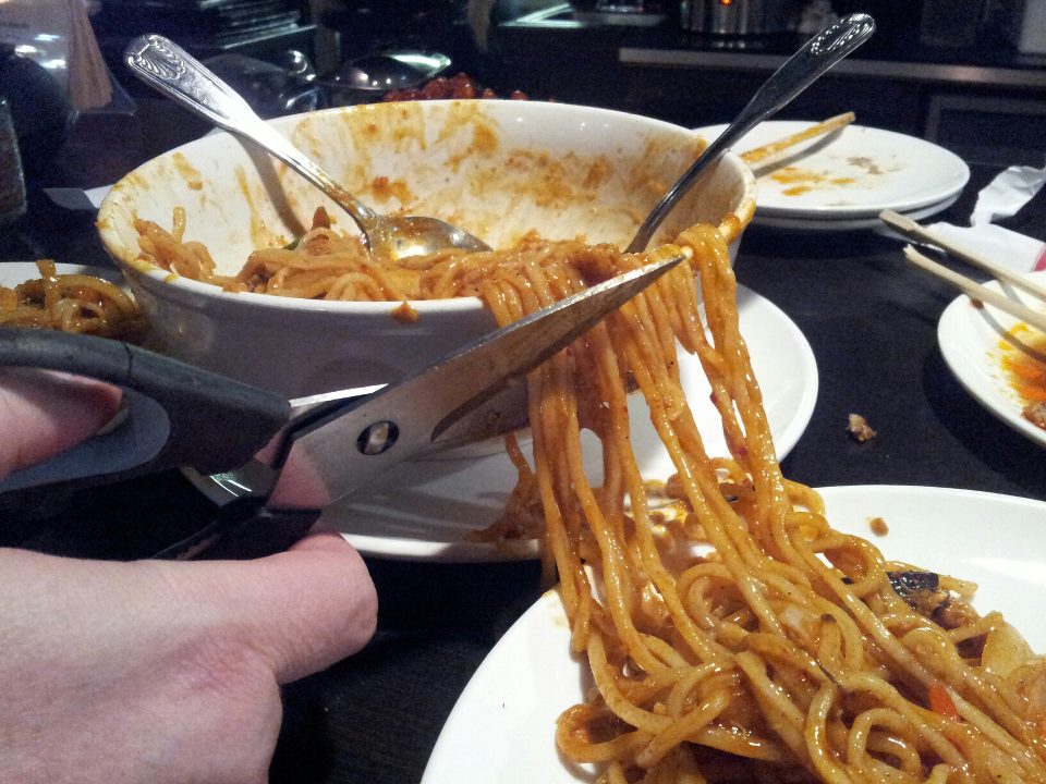 This year’s New Years Eve celebration was a far cry from last year’s. I’m not saying it wasn’t as good, it was just good in a very different way. Instead of being surrounded by hundreds of people in a small town convention center while being bombarded with cheesy country and 80s hits, it was just the two of us, hanging out at home, having a blast as usual. We both got out of work early…ooh, and it was snowing! Just enough to give us a light dusting, though. Tara was extremely unimpressed. We had been trying to decide whether to go out somewhere and party or stay at home, so we ended up compromising and did a nice Chinese dinner out, then came home. Tried a spot in Portland with great Yelp reviews called Shandong, and the place was hopping. The food was delicious, too: not your standard ultra-Americanized fare. Forget crab rangoon and sweet ‘n sour pork, we ordered Chilean rock crab and and shiitake shao loong bao. And pork with garlic and ginger infused cherry sauce. And red curry crab noodles. This place makes all their noodles from scratch, and they are three feet long so they serve them with a pair of scissors for cutting.
