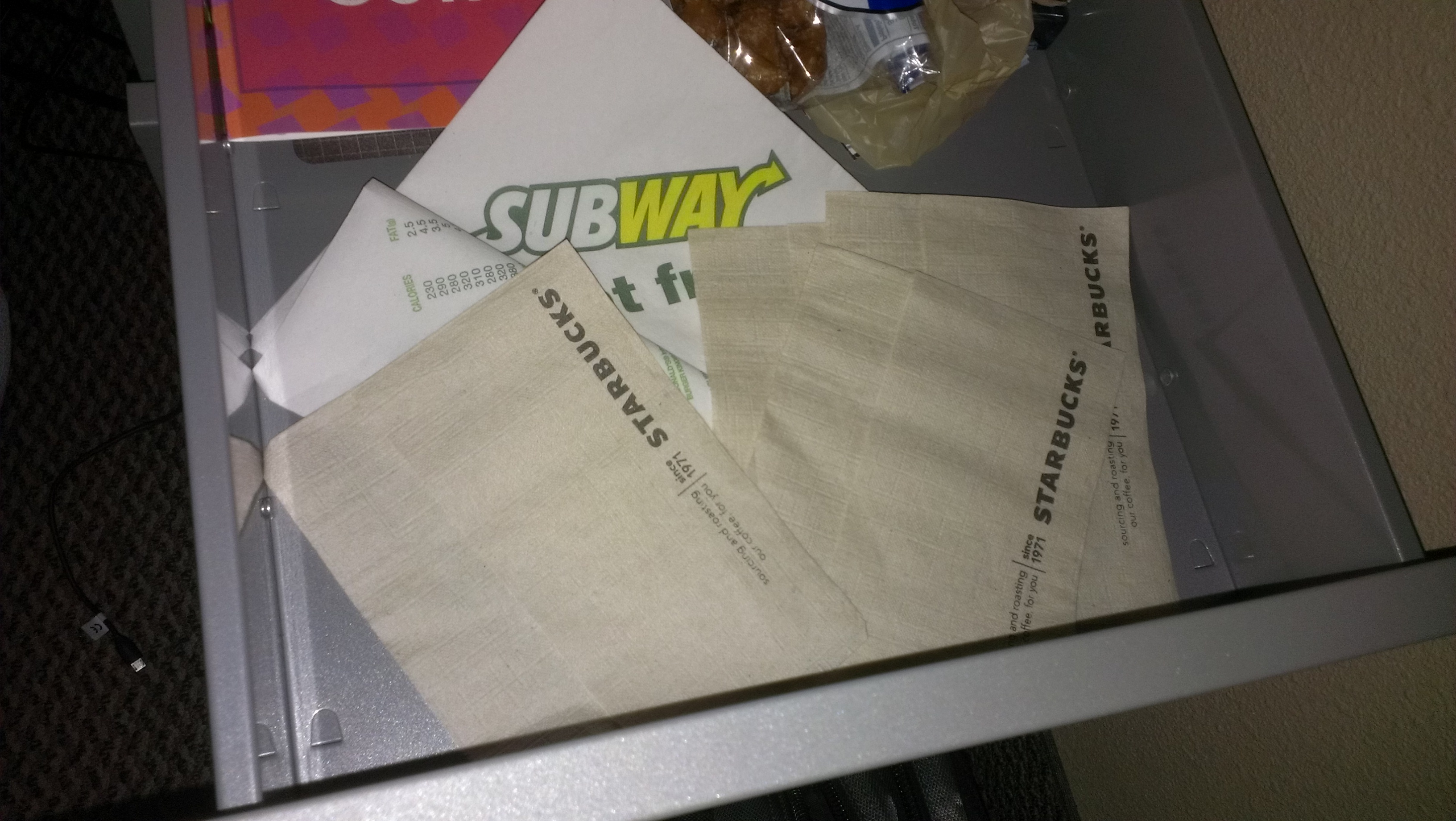 As a result, I’ve got extra napkins tucked away everywhere. My filing cabinet and desk at work. The center console of my car. Stuffed down the front of my pants. (Though, ahem, those are always there). I suppose if the shit ever hits the fan and there’s a massive ketchup spill threatening the city I’ll be prepared, but the odds of that happening have gotta be on the slim side.