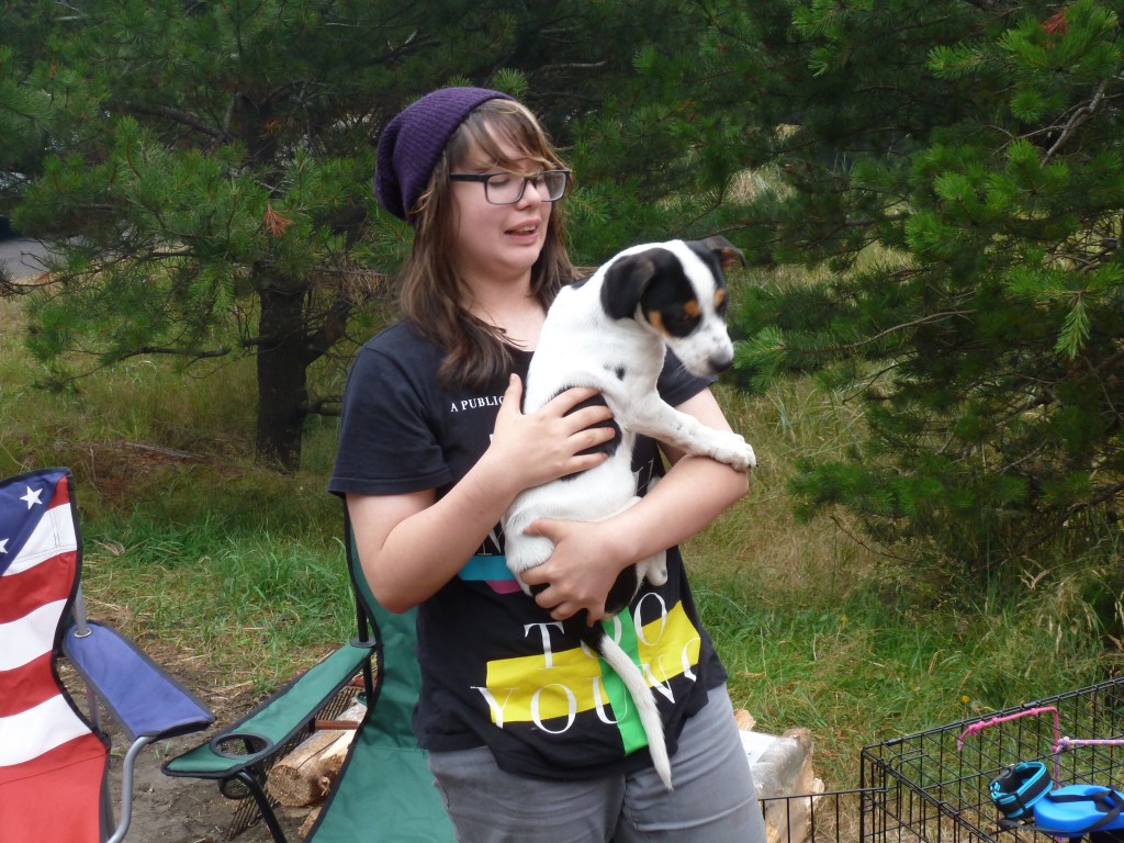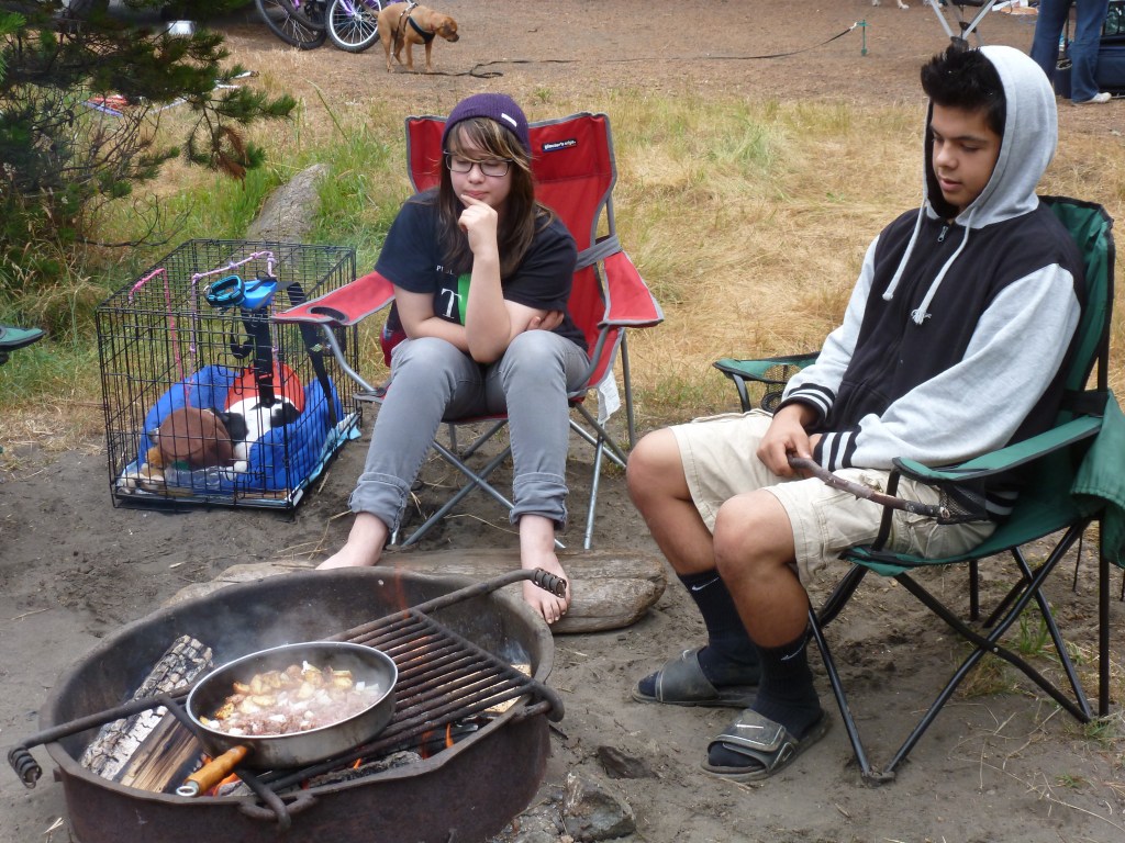 And firewood, and a new camp table, and air mattresses, and…well, it all adds up. A lot of these were one-time purchases. I’m sure our next trip will be much cheaper. That night we loaded the cars, as in plural. With the kids coming along, and a dog – Audrey’s new puppy – and all that stuff, there was no way we could all fit in one car. We hit the road a little after 6:00 Friday evening, and didn’t pull into our camping site – Cape Disappointment on the Long Beach peninsula – until about 8:45. It was overcast and chilly, and darkness was already settling in, so we started a fire and got our tents up right away. The kids were very helpful; they even got their own tent up without assistance, and I was impressed since this was only their second camping trip in a tent in…well, EVER. I have to say, we really enjoyed their company all weekend. With Rusty working a part-time job now, and Audrey taking care of a dog, they both seemed much more responsible than before. And it’s barely been a month since they lived with us! The weekend made me realize how much I miss them.