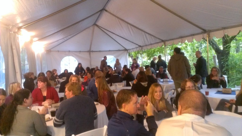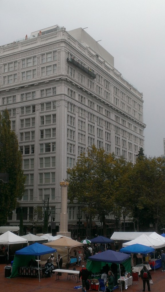Saturday was another early morning, but I left an hour later this time, and that worked out much better. Breakfast, more presentations, lunch, and then three hours of free time (I took advantage by driving to Powell’s Books) before we boarded buses to head to McMenamin’s Edgefield, a resort hotel in Troutdale where we were to golf, drink, and have dinner outdoors under a tent. Now, you’ve heard the phrase, the best laid plans of mice and men oft go astray, right? When this event was planned months ago, we figured the weather would still be nice in late September. Normally, it is. Last year, this same weekend was sunny and warm. This year? Ha. No…more like, HA. It started raining Friday morning and continued nonstop through Sunday night. Not just a little rain, either: monsoon rain, complete with 45-mph wind gusts and flooding and a lot of downed branches. Portland received almost 3″ of rain over the weekend, and set a record for the wettest September ever. Suffice it to say, the golfing event never happened except for a few hardy souls who gave up after sloshing through ankle-deep water 3 or 4 holes in, and the dinner beneath the tent was a wet and windy affair that found most of us huddled together for body heat. I was asked many times by our out of town guests, “Is it always like this around here?” I’d reply, “Not always. July is pretty dry.” We were back at the hotel by 8 PM, and for me, the symposium was over. Whew! It felt great to walk through the door an hour later and kiss my wife.
