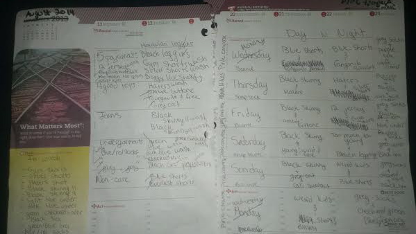 She even listed items that were currently in the washing machine as she was compiling her notes. And she’s got outfits broken down by day and night. I’m beginning to think my daughter might be a little bit OCD.