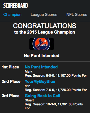 Err…yeah. That was my plan all along, outsmarting the competition! Actually, as much as I’d love to take credit for being all stealthy like that, it was not my plan at all. I just basically made poor decisions. The above ever-so-helpful proclamation of doom and gloom hardly instilled confidence in my season, but this year instead of sitting back and hoping for the best, I decided to work at putting together the best team I could every week. In the process I turned into a full-blown fantasy football nerd – watching the waiver wire, adding and dropping players, making substitutions, reading the experts’ picks – and put together a winning season. I coasted through the playoffs and felt vindicated when this happened.