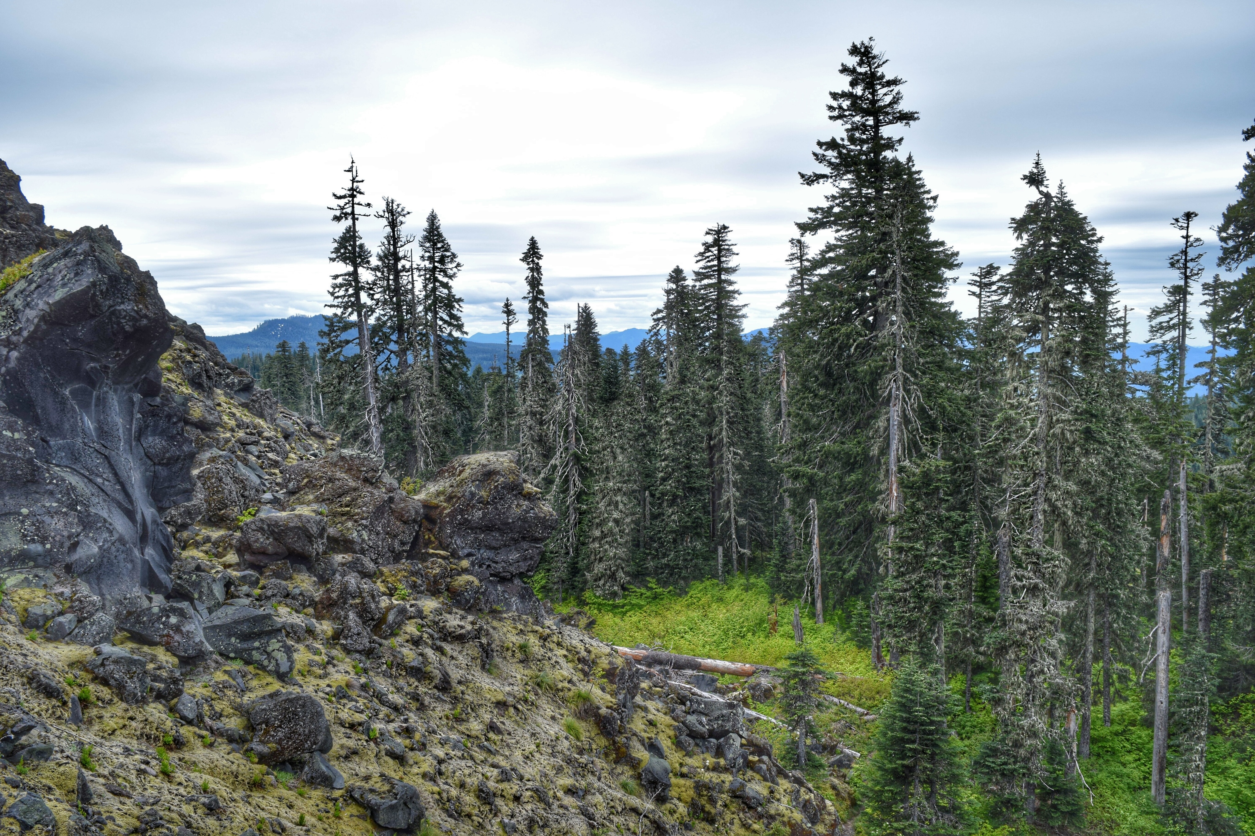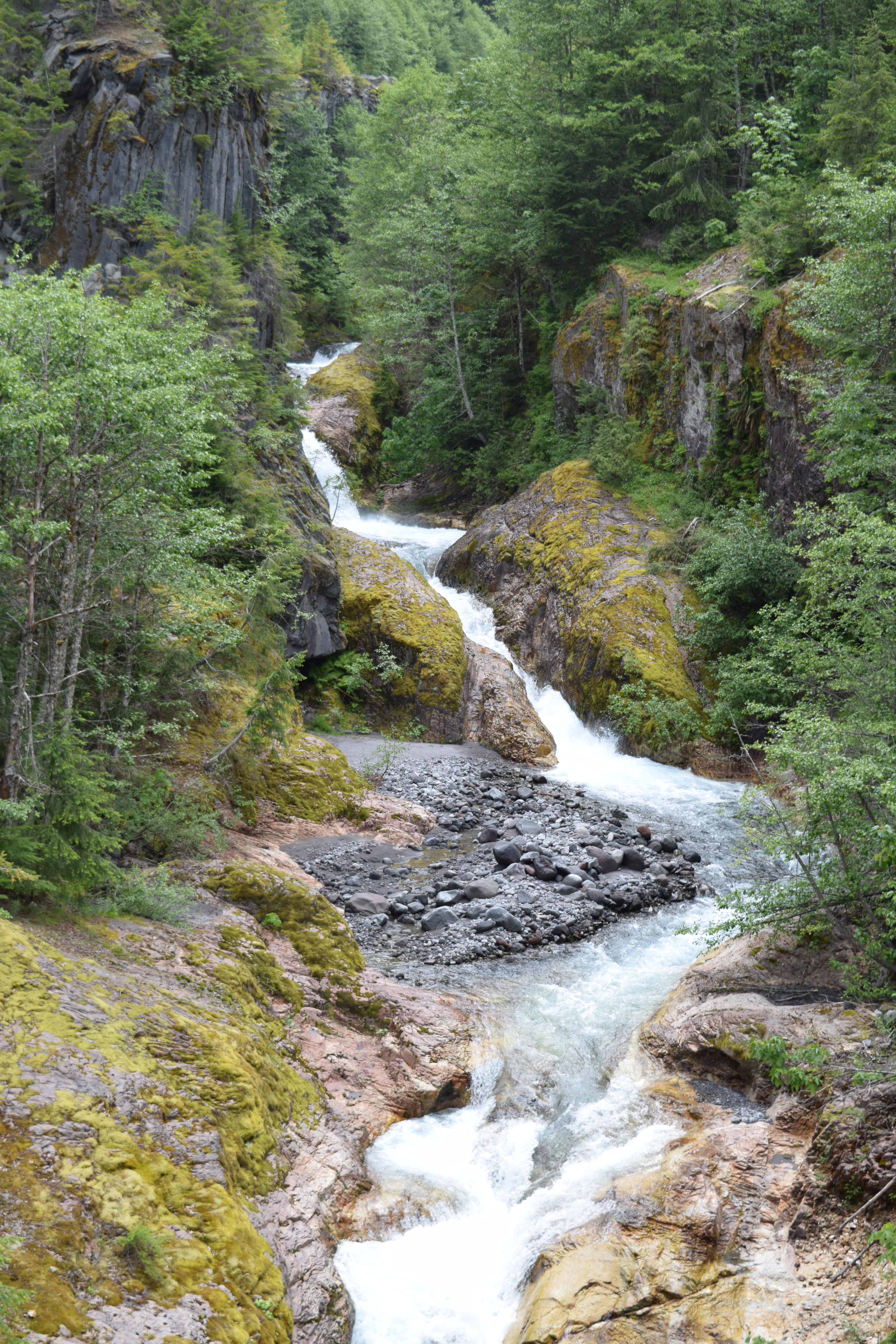 Sure enough, by that afternoon she’d come down with a similar case of the Dreaded Sickness. Which meant a change in plans for our weekend. We had been planning a visit to a state park/waterfall in Oregon and a detour through Stevenson to check out some property we found, but that’ll have to wait for another time now. Instead, I drove out to June Lake up near Mount St. Helens for some hiking while Tara stayed home and tried not to cough up a lung. Poor thing. It was cool and cloudy, only 52 degrees up by the mountain, damn near perfect hiking weather in my opinion. I had a great time. Did four miles in and around the lava beds surrounding the lake, then another mile and a half through Lava Canyon. That second hike is particularly beautiful, but always crowded with people, and Saturday was no exception. Not that you can tell from this photo, taken from the middle of a swaying suspension bridge connecting both sides of the canyon. It’s not an ideal spot if you’re the least bit leery of heights. Or of plummeting hundreds of feet to your death when a flimsy wooden slat breaks beneath your feet.
