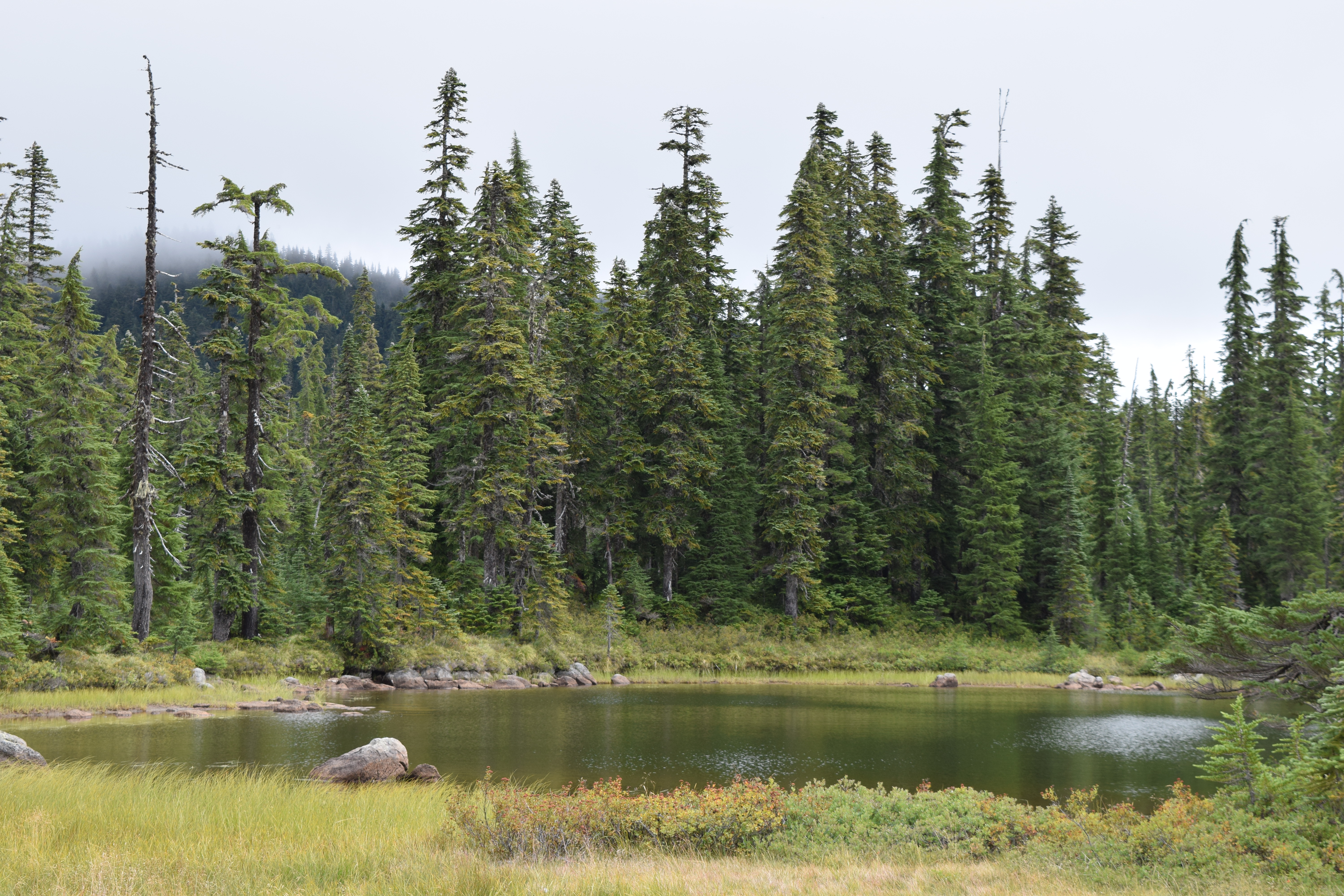 We got to Thomas Lake shortly after 11, and there was a definite chill in the air. It was only 49(ish) degrees, which felt great considering we’d baked in 100-degree temps a mere nine days earlier. I hadn’t checked in advance to confirm that the huckleberries had ripened, but experience has taught me you can pretty much count on them showing up come September, and sure enough, they were everywhere. In fact, it seems to be a banner year for these tiny, succulent fruit, which resemble small blueberries but taste even better. They were growing prolifically all along the trail, and quite a few other people were out there picking them with us. Everybody was commenting on how plentiful they were this year, and how big they were too. I have to agree. Maybe it was due to our more “typical” summer weather this year – except for the last few weeks of August, it wasn’t too hot most of the summer, and the nights cooled off nicely. Who knows? I’m no botanist. The point is, they were everywhere, and we filled two bags full.