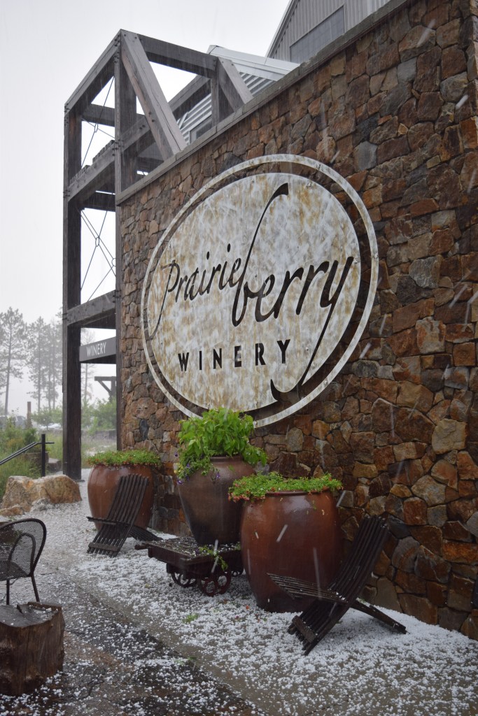 After hanging out at Sylvan Lake for a little bit, we drove out to Hill City to stop at Prairie Berry Winery for lunch. We decided to eat on their covered patio, and were midway through our meal when all hail broke loose. Literally. One moment it was quiet; the next, thunder roared, lightning flashed, and a drenching rain – accompanied by hail the size of ping pong balls – came crashing to earth. It was so loud under the tent it sounded like a freight train. Suddenly, there was a river of hail sweeping through the place, and it piled up about 2′ high under the gutter. That’s feet, not inches.