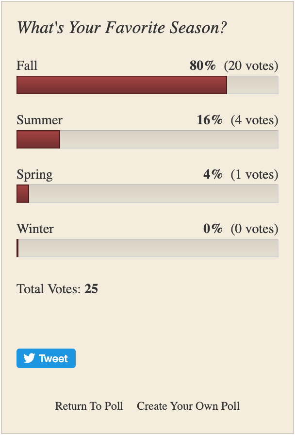 BTW, the official results for my “Favorite Season” poll are in. Can’t say I’m the least bit surprised…