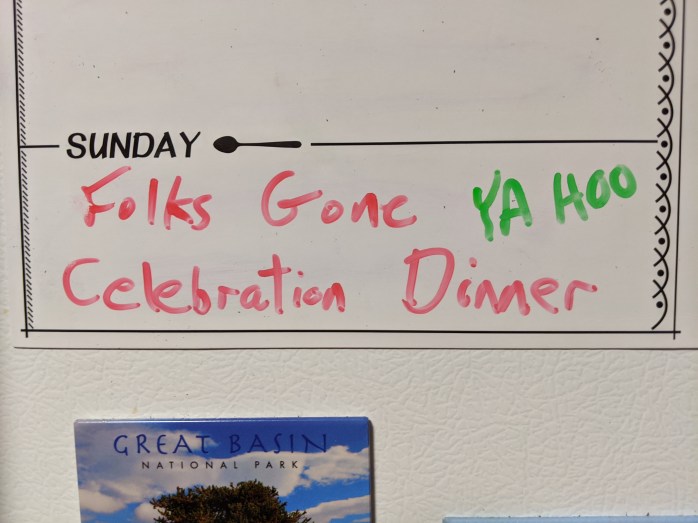 My parents left today after a nine-day visit. I think they were concerned they were overstaying their welcome, because my dad wrote this on our weekly menu planner for today.