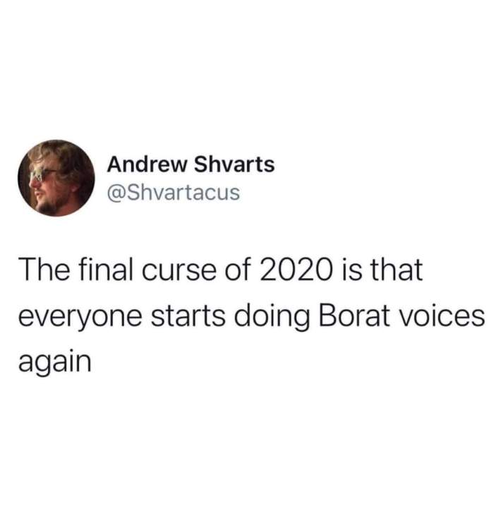 Saturday morning we watched the Borat Subsequent Moviefilm. I’m sure it’s not everybody’s cup of tea, but goddamn, did we laugh our asses off. It made for glorious morningtime and was very nice. Later, I saw this meme…