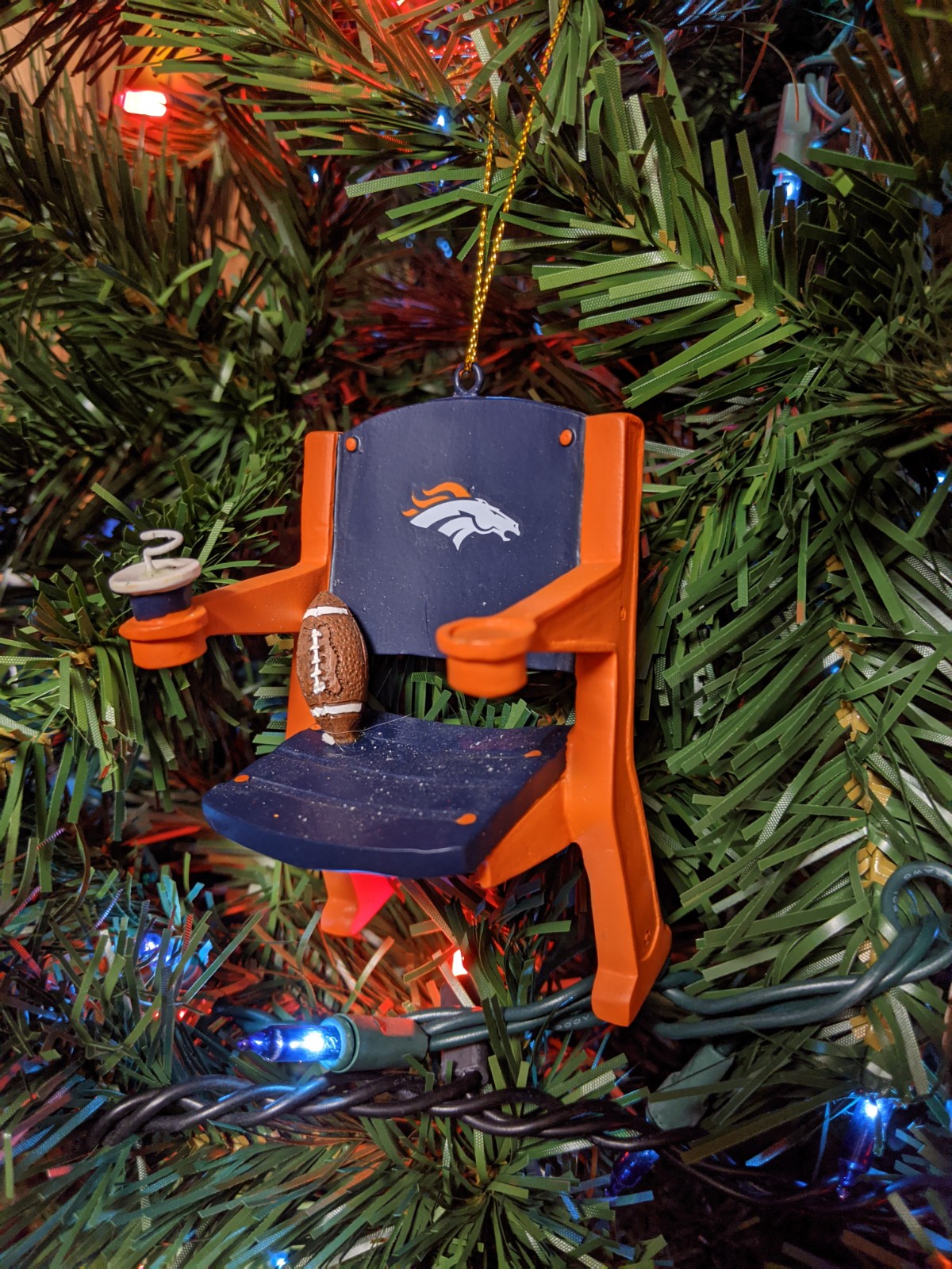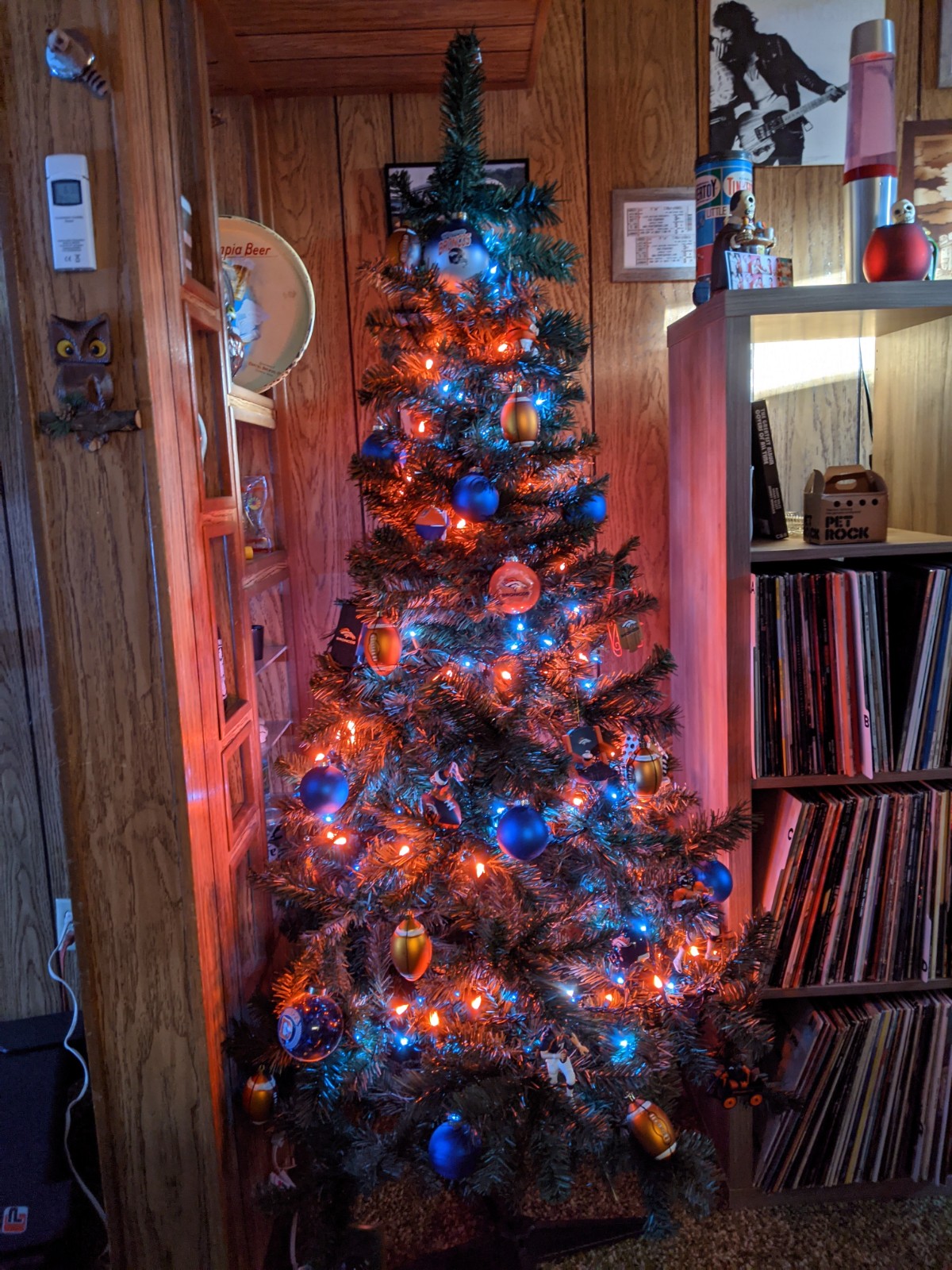 I can’t say today was relaxing, but it was productive. After breakfast, I ran to Menards for some more Christmas lights. I emerged $198 poorer, so that gives you some inkling over how seriously I’m taking this friendly little neighborhood competition. I bought a lot more than just lights, though—including a cheap fake tree for the basement. Over the years, we have collected quite a few Denver Broncos ornaments, so we decided to set up a Broncos-themed tree downstairs this year…complete with orange and blue lights. We’re pretty happy with how it turned out.