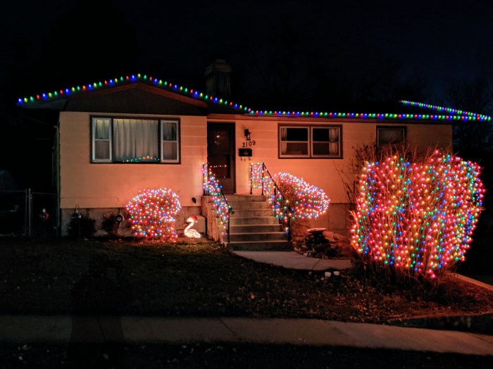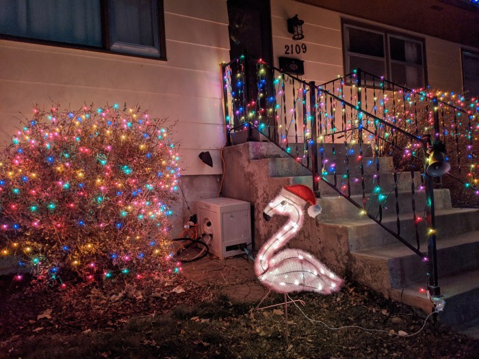 We decorated the yard ourselves but hired a guy to install the lights around the eaves. It wasn’t cheap, and in the end, they eschewed tall ladders and simply climbed onto the roof to do the work. Pretty smart, actually. Our roof isn’t very steeply pitched and is easy to access from the backyard, so I’ll probably just do that myself next year.