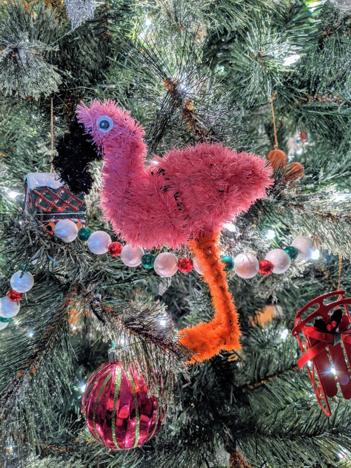 It’s always a joy to find an unexpected flamingo from an anonymous sender in your mailbox! Actually, there were two — a veritable mini flock, if you will. This ornament and an ice cube tray.