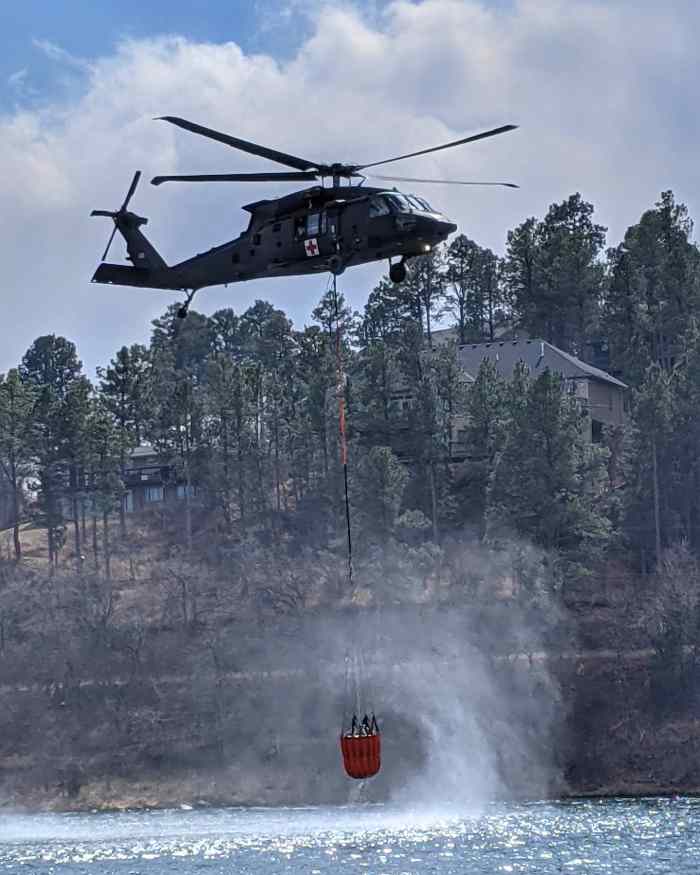 National Guard Black Hawk helicopters were filling 660-gallon drums of water from the lake to dump on the fire. Every few minutes a new one would swoop in. I was so close to the action, I got sprayed with water when the bucket dropped at one point. Totally worth it for the shot! The choppers would fly off to join air tankers dropping red fire retardant on the flames. It was all quite the show.