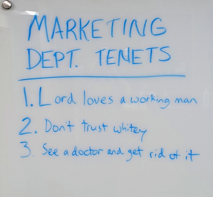 My coworkers were a little confused about the change to the white board in our lobby when they arrived yesterday morning. I’d simply taken the liberty to replace the real tenets (“Less is more,” “It’s about them, not us”) with updated ones that Navin R. Johnson would appreciate.