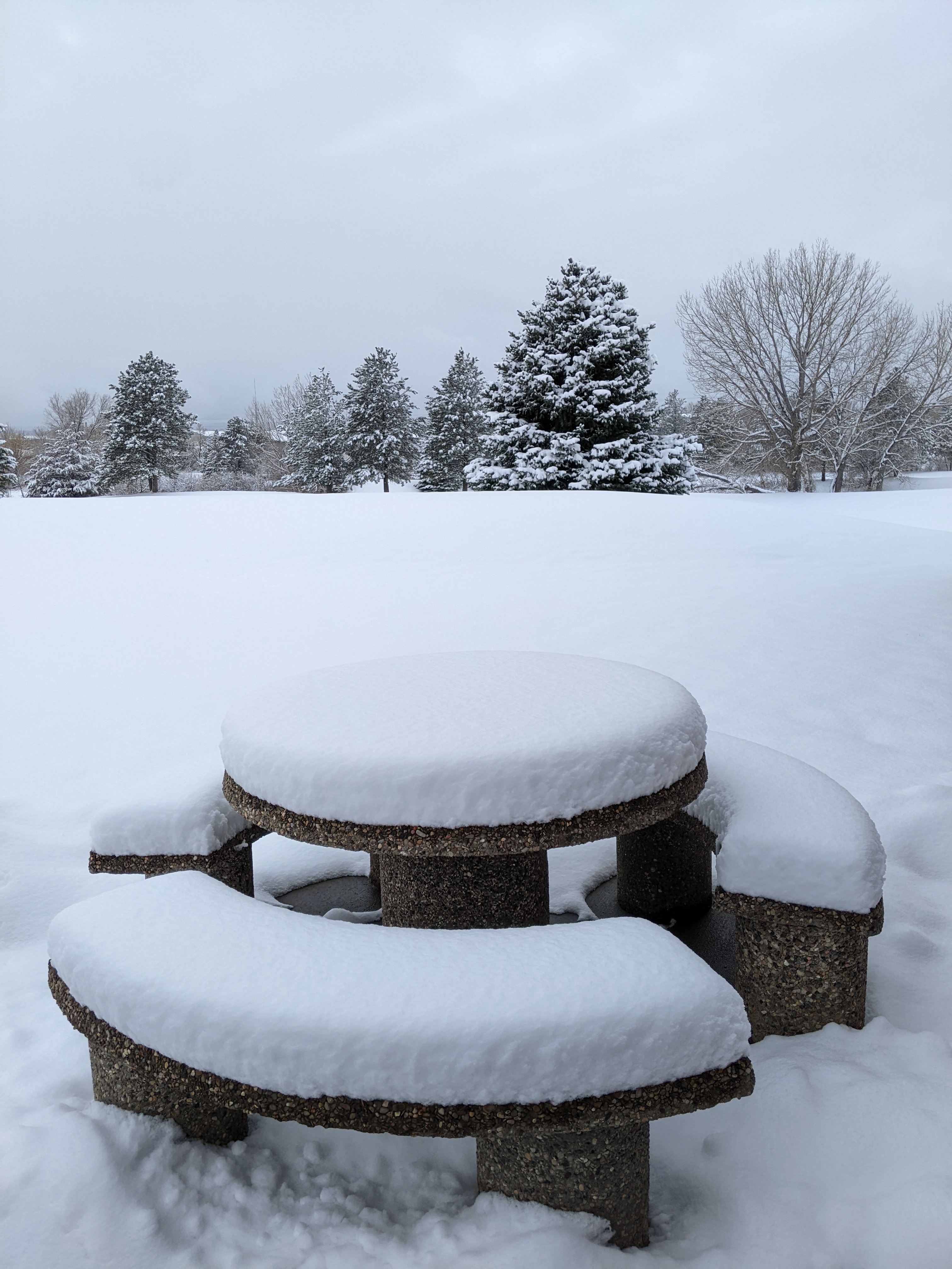I asked my manager if I could just work from home through lunchtime and come in afterward and she was fine with that. Which worked out well, as it gave the plows time to work their magic on the main arterials. The commute wasn’t entirely drama-free; I passed a jack-knifed semi on one stretch, and it was still awfully slippery. But my Kona handles these conditions well and I made it to work without incident.