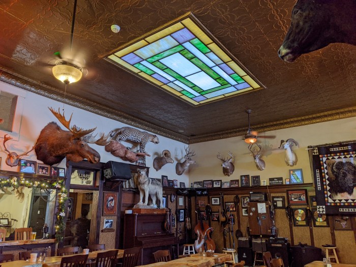 Back over the mountains we headed. Got back to Buffalo late afternoon and walked down to the saloon in the Occidental Hotel, where we parked ourselves for the next 5+ hours. Really cool place that dates back to 1908, and it’s filled with the usual Old West decor: lots of mounted animal heads and other paraphernalia. Supposedly, there are still bullet holes in the ceiling from the rough ‘n tumble outlaws who liked their whiskey cold and their women hot.