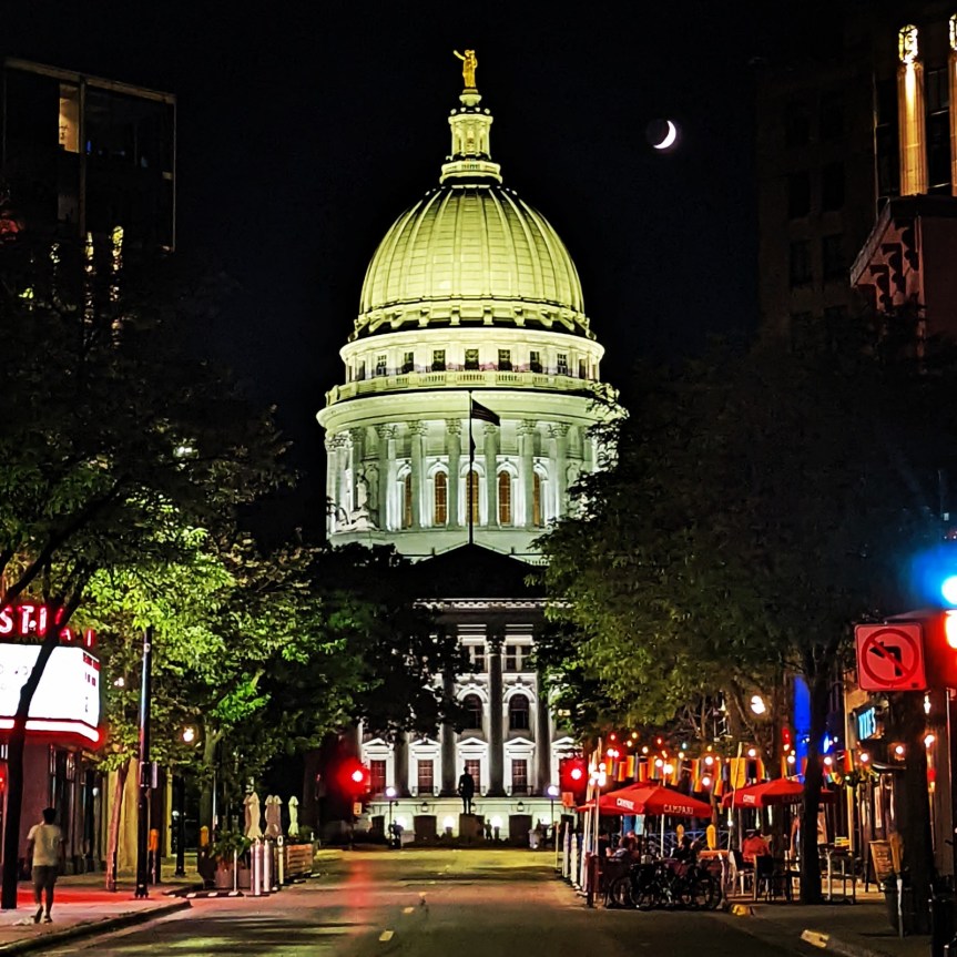 Back at the hotel, we walked down State Street in search of t-shirts and food. Luckily, we found both. Tara wanted a slice of pizza and a salad, while I chose a more exotic because-I-can roast duck hand-pulled noodle from Ruyi. We took those back to our room and ate there. The rest of the evening was relaxing; Tara read and I thumbed through my phone before growing bored, so I decided to take a walk. Took in Madison one more time, because it was our final night.