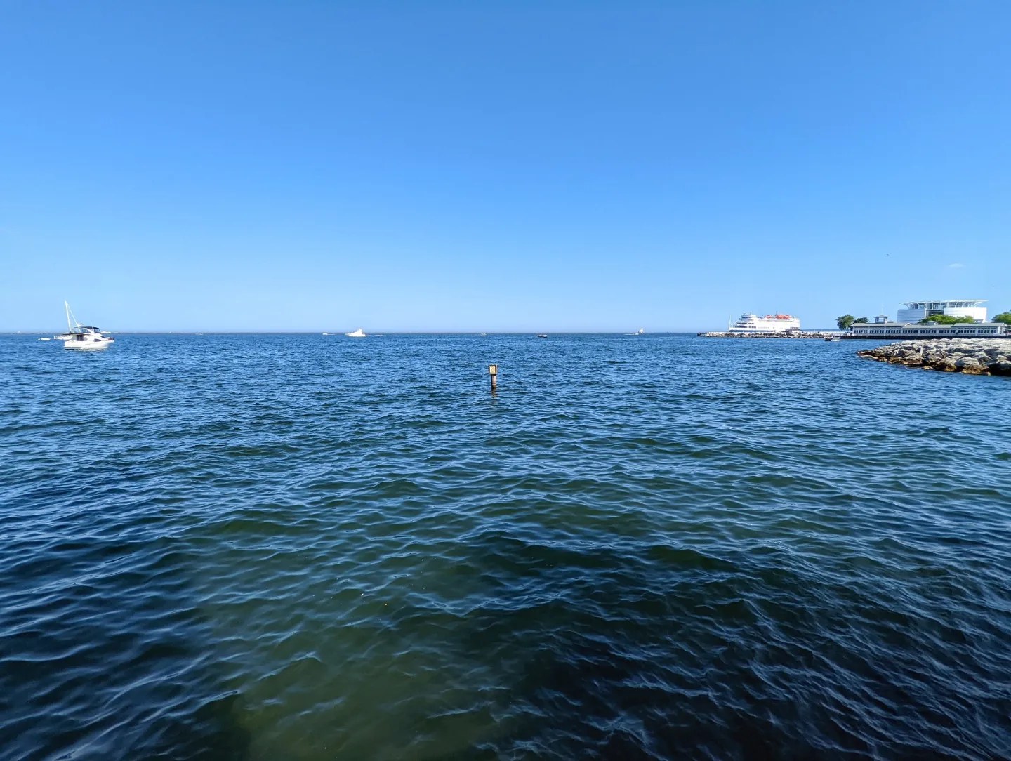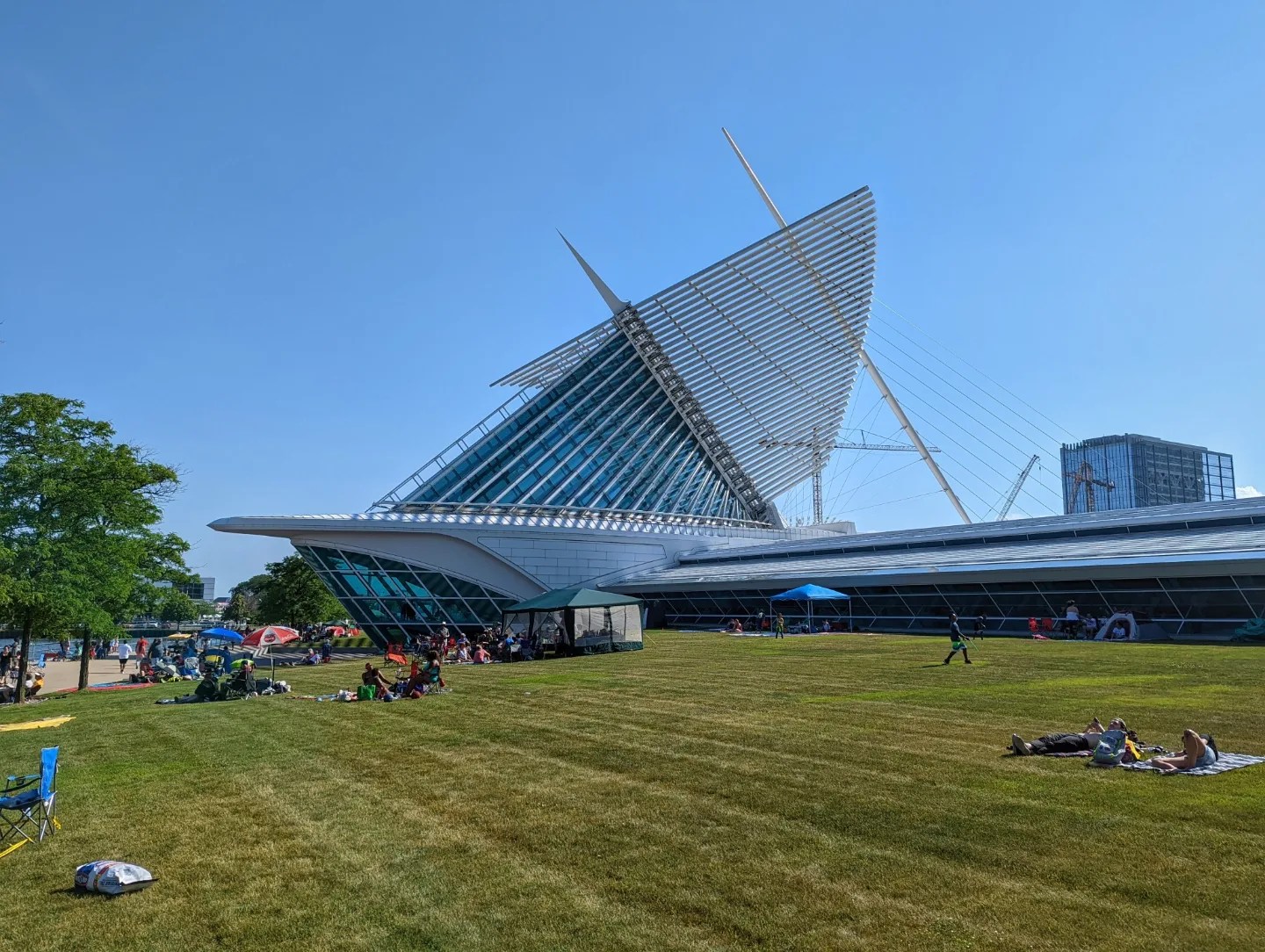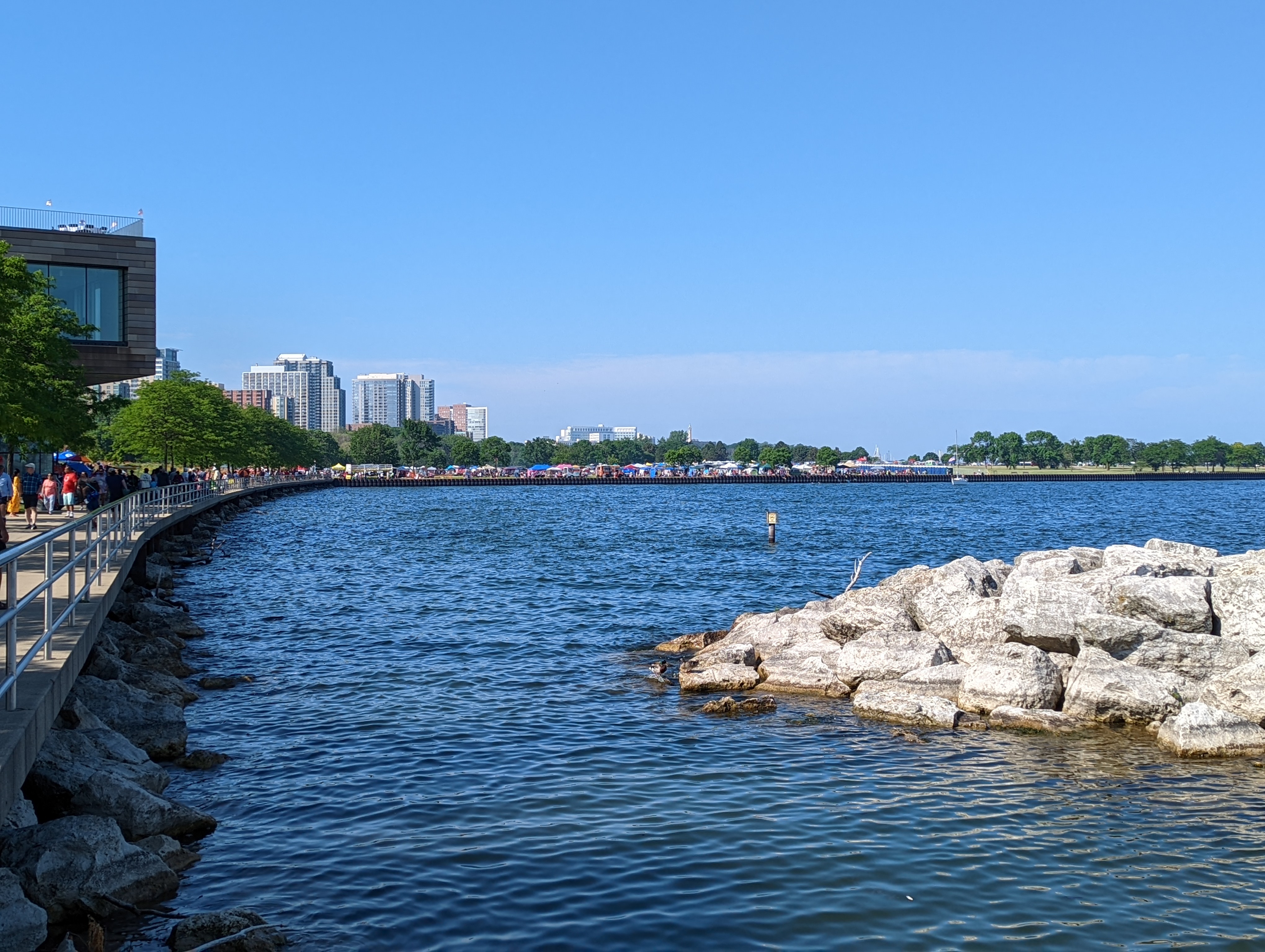 Thousands of people were lined up along the shore of Lake Michigan for Summerfest and the attendant fireworks. We briefly debated staying ourselves, but sunset was still four hours away, we weren’t dressed for potentially chillier weather later, and walking over a mile back to our parking garage after dark in an unfamiliar city didn’t seem wise. Instead, we sat down for a little bit, people-watching and gazing at the lake, before making the trek back to our car.