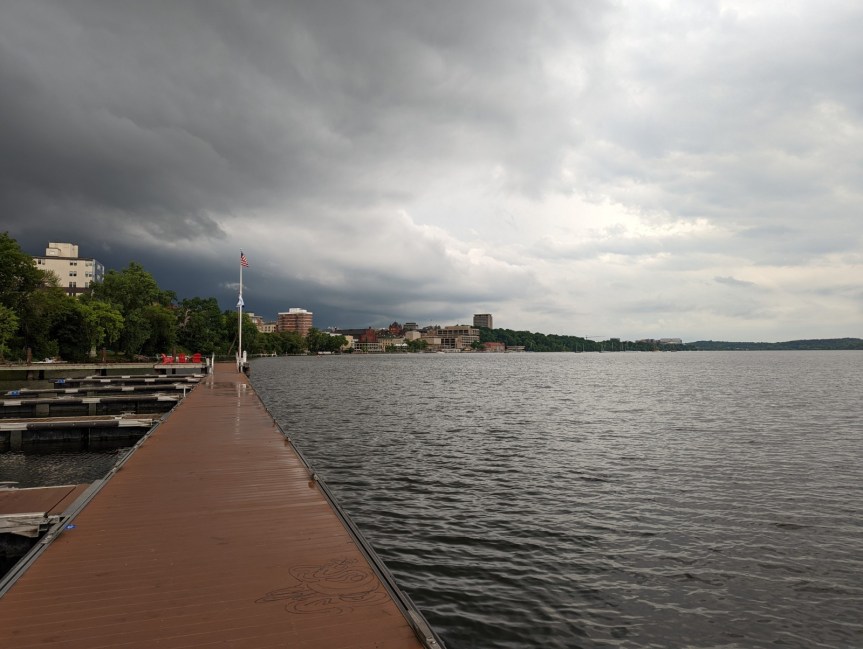 I found myself standing on a floating dock on Lake Mendota, admiring the stormy skies and fireworks in the distance.