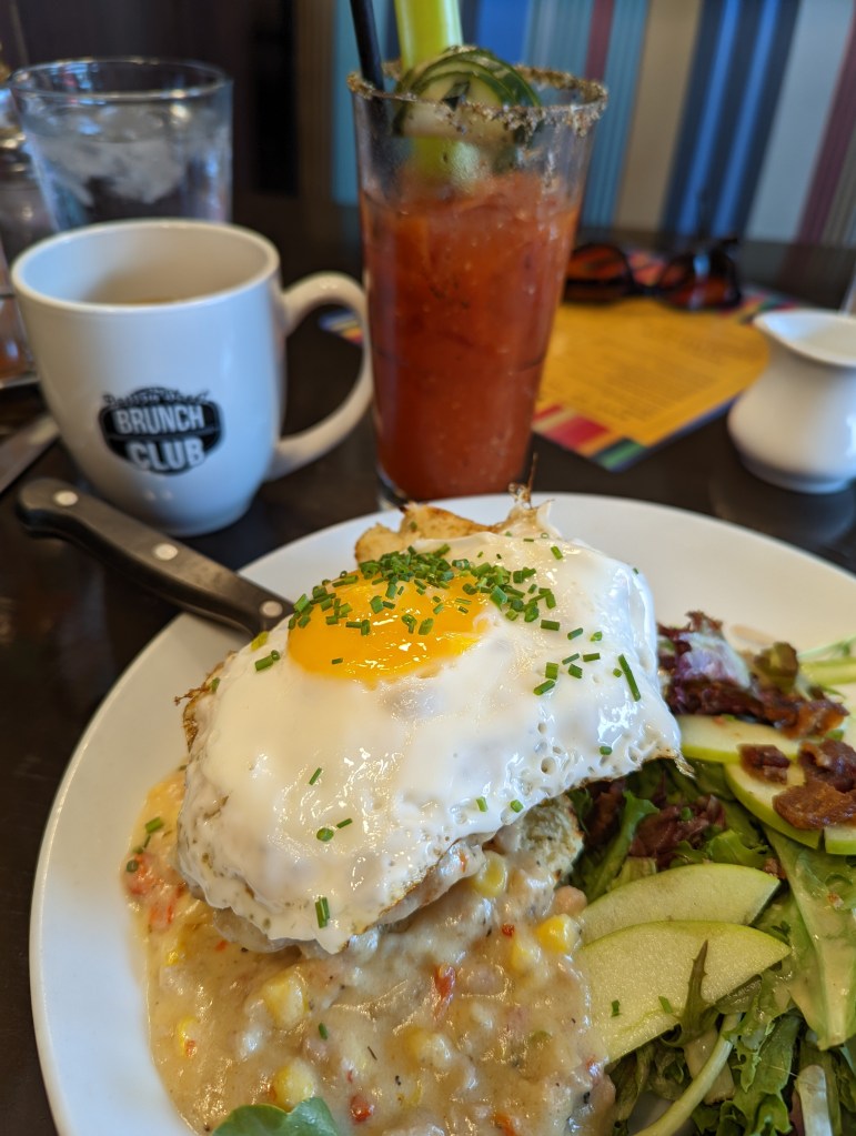 After sleeping in Sunday morning, we walked down to the restaurant. There was a short wait, but those 11 minutes were worth it for the buttermilk-fried chicken breast sandwiched in a buttermilk biscuit, smothered with a sweet corn-sausage gravy, finished with a sunny side up egg and apple-bacon greens (total copy-and-paste job from their website). Washed down with a Bloody Mary, of course.