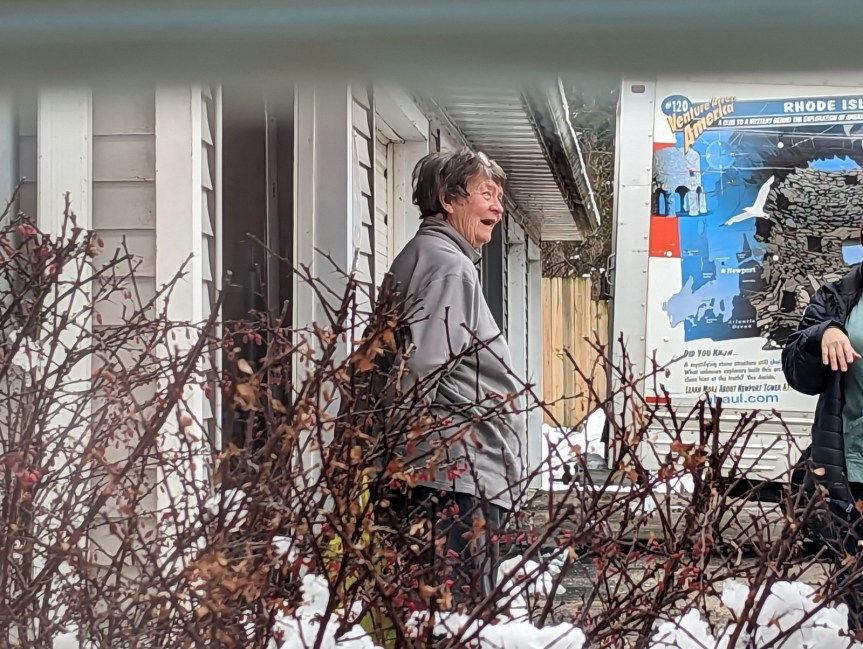 Saturday dawned overcast but dry, and the roads were perfectly fine. Despite all the snow, our temperature was in the mid-30s, so there were no travel impacts. We grabbed breakfast at a greasy spoon downtown called Scottie’s Eat-Mor, and even though we showed up at an ungodly hour—shortly after 6 a.m.—the place was hoppin’ with locals. No surprise: the food is delicious, and the prices are unbelievably cheap. We paid something like $6 apiece for a breakfast skillet and an omelet, plus coffee. There are only about 20 stools around a single counter, so we were lucky to find a couple of seats. Fueled up for the big move, we headed back to the apartment, picked up the U-Haul, and started loading my car with some smaller items. Earlier, I’d said, “I wonder how long it will be before Nancy comes over to chat.” The answer, of course, was: not long at all.