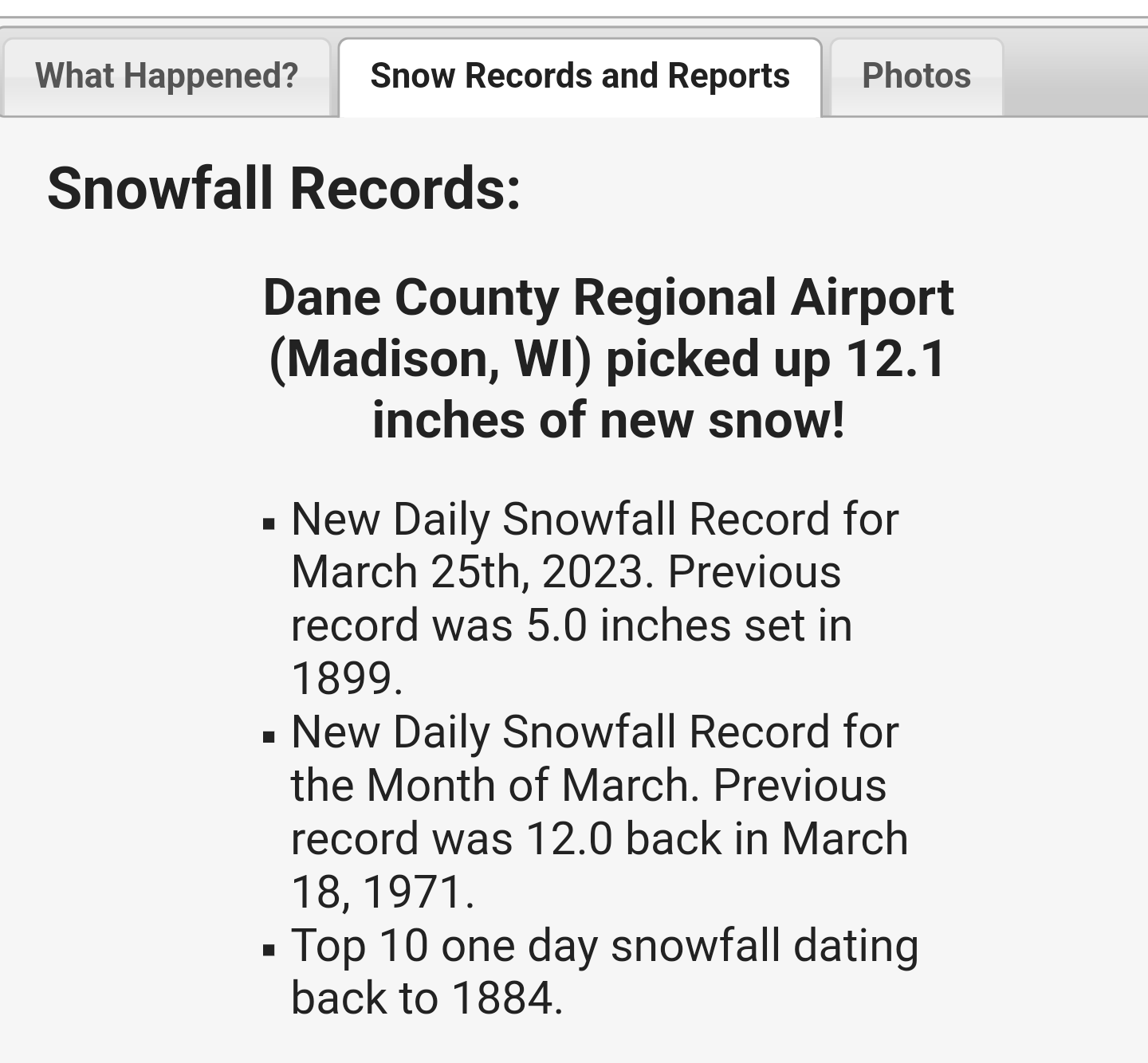 Remember how southern Wisconsin had its snowiest March day in 15 years a couple of weeks ago? That was nothing compared to Saturday, which turned out to be the snowiest March day ever. When we pulled back the living room drapes, we were greeted by the following sight.