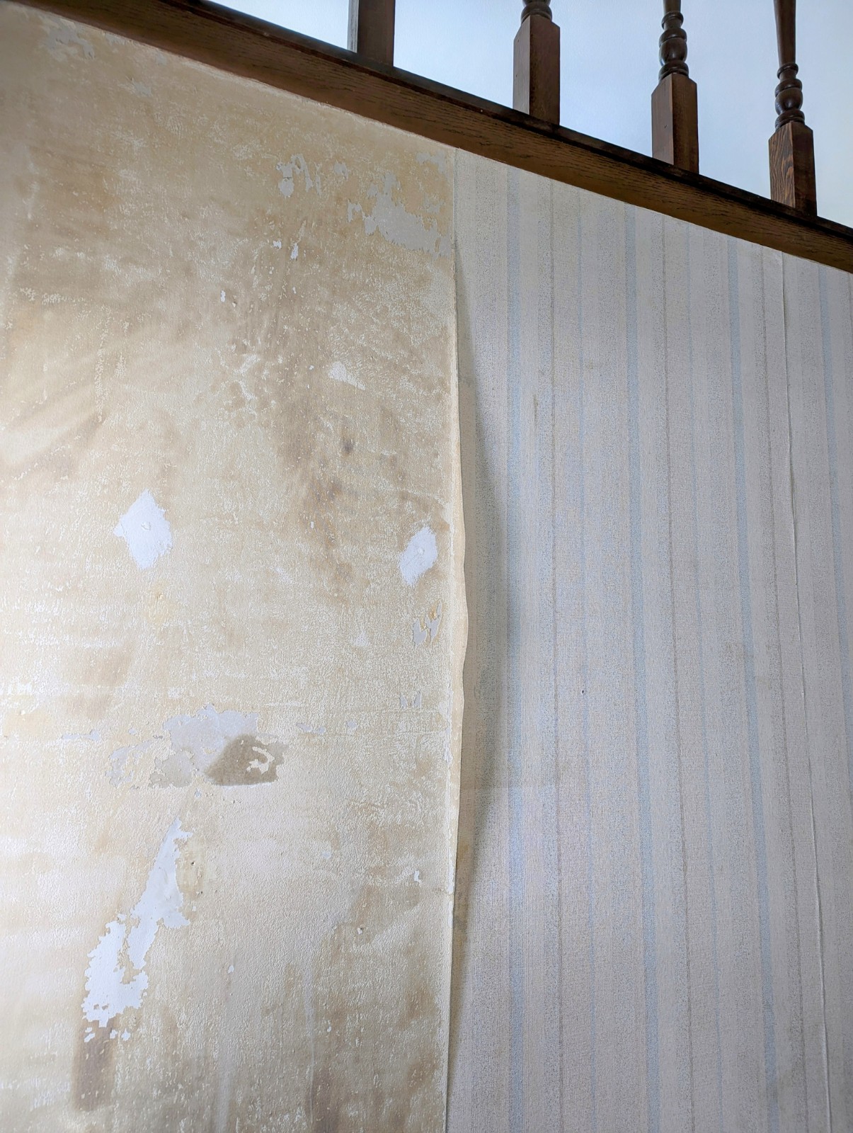 Anyhoo. That entryway was covered in ugly 45 y/o wallpaper. Look, I love the ’70s even more than most people, but I do have to draw the line somewhere. Striped wallpaper is apparently it. And because the ceiling is so tall, removing it would have been a real pain in the ass. Especially over stairs. Not gonna lie: I have a small fear of heights.