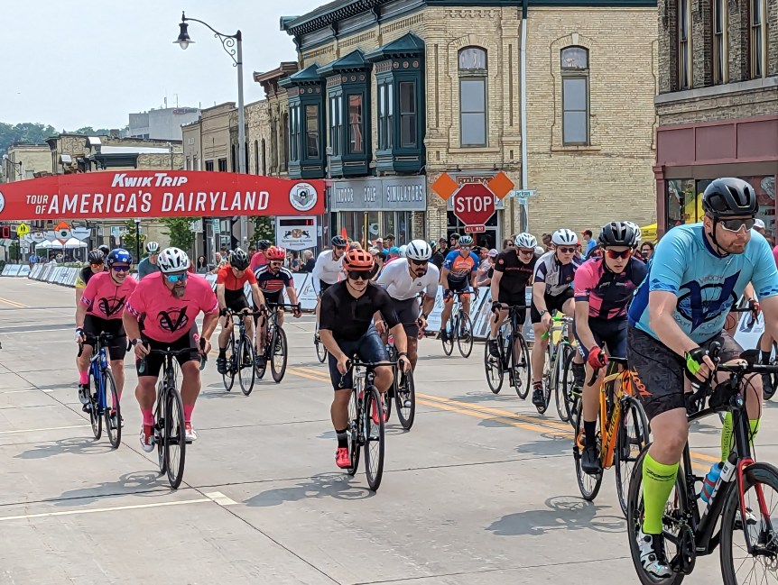 So, anyway, we had a good and productive meeting today. And then we all walked two blocks downtown, where Janesville was hosting the Tour of America’s Dairyland, the largest competitive bicycling race in the U.S. I am famously and on the record not a fan of bicycle races, but when lunch (and a cocktail!) are included, and you get paid for sitting around outside and chatting with people who think you’re a rock star, your tune changes.