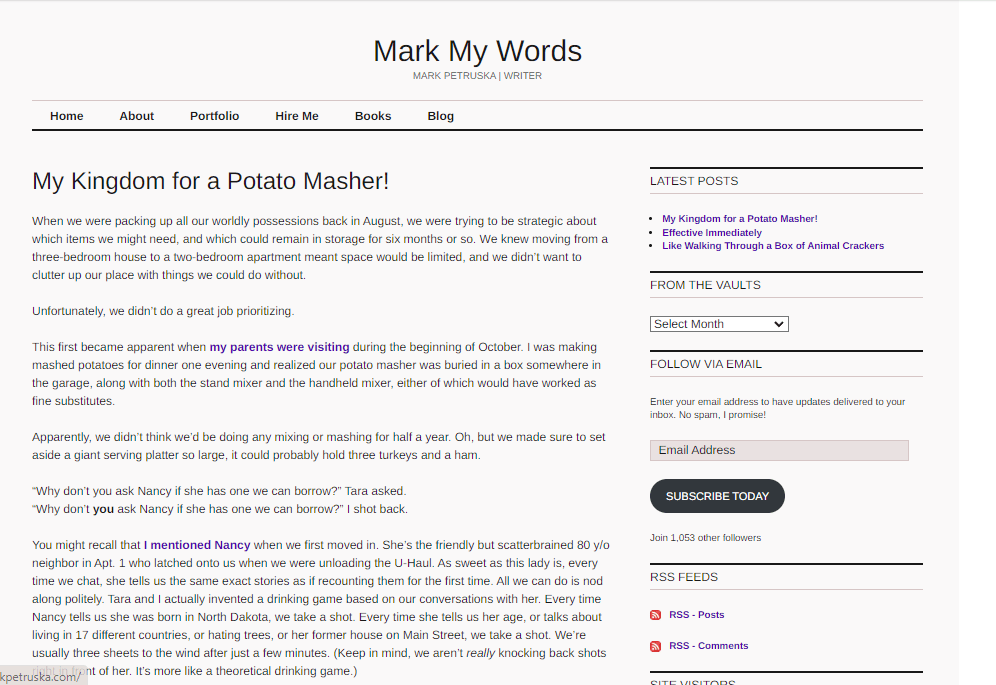Take Mark My Words. I’ve cycled through more blog themes than Elizabeth Taylor had spouses. I visited the Wayback Machine recently and took some screen shots for posterity.