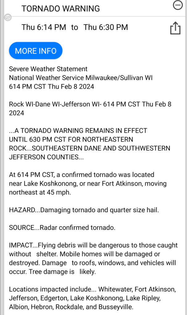 They’d been forecasting a chance of thunderstorms for our area, and in fact, Tara had just moved her pickup into the garage as a few pulses of lightning flickered to the west. But tornados? In February?? That had never happened in Wisconsin before.