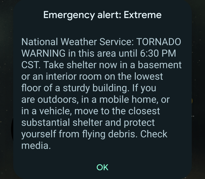 Sadly, any illusions that I would act heroically in the face of danger were squashed Thursday evening, when out of the blue – quite literally, as the sun had been shining brightly an hour earlier – an otherwise peaceful evening was interrupted by blaring alerts on our phones. I figured it was an Amber Alert or something, and was actually shocked when I saw the message.