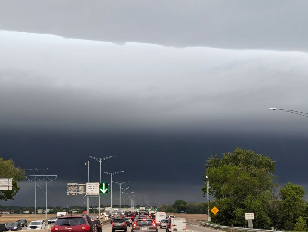 I’d been watching the horizon closely; the nearer I drew to CheeseGov, the more ominous-looking the sky appeared. As I merged onto the Beltline, an impressive shelf cloud was bearing down from the west. If you’re unfamiliar with this weather phenomenon, a shelf cloud is not a cloud designed to hold books, framed photos, candles, and knickknacks from your Florida vacation. It’s a low, horizontal cloud formation at the leading edge of a line of strong thunderstorms. When you see a shelf cloud approaching, you know shit’s about to get real.