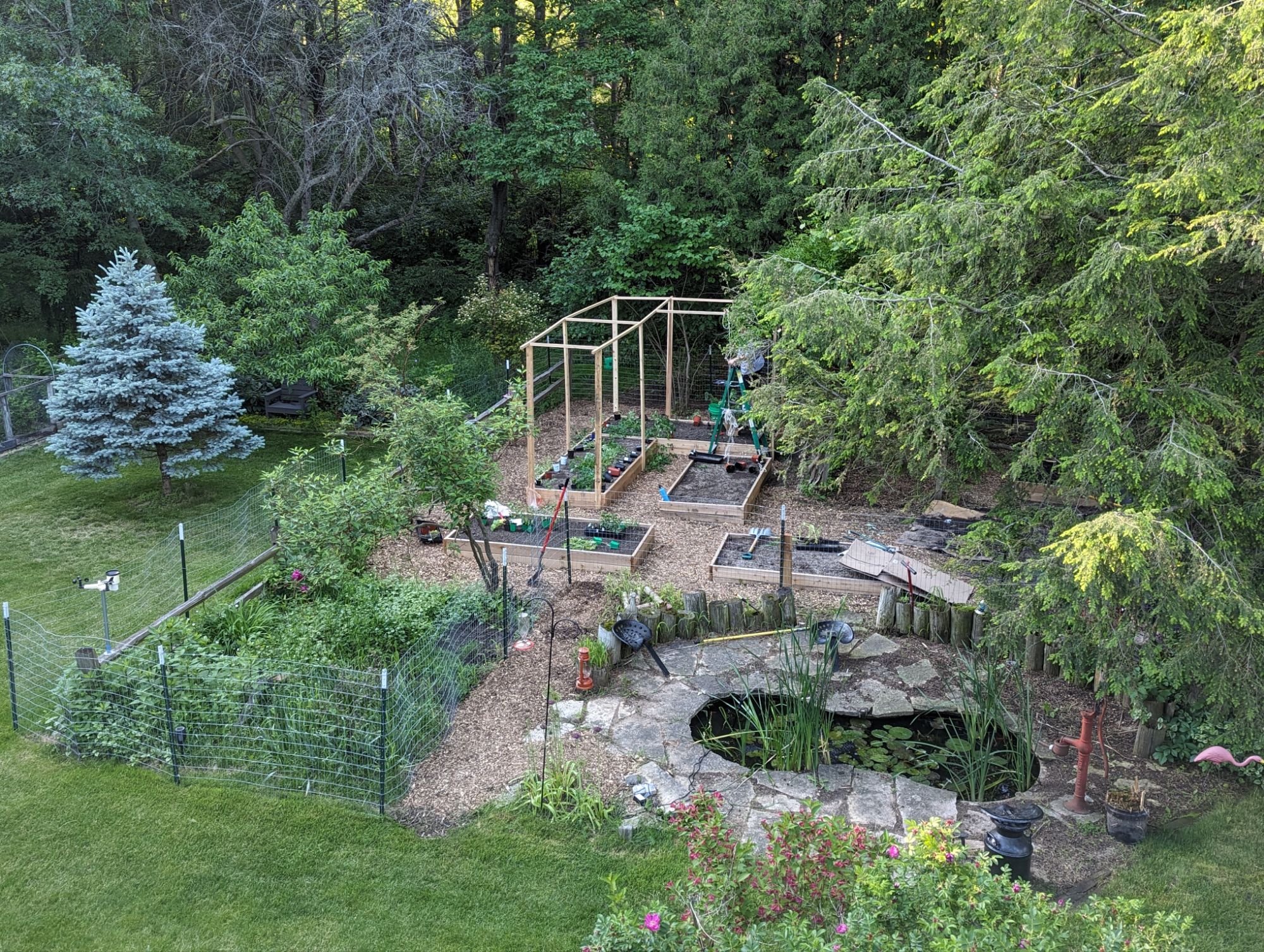 The whole garden is enclosed in a welded wire fence to keep the critters out. It ain’t pretty, but it gets the job done. Eventually, we’ll upgrade to something more professional. All the wood chips are leftovers from the trees we had taken down in December. You might recall my two-day project carting that mountain of mulch across the yard one wheelbarrow-full at a time. I’m glad all that hard work paid off.