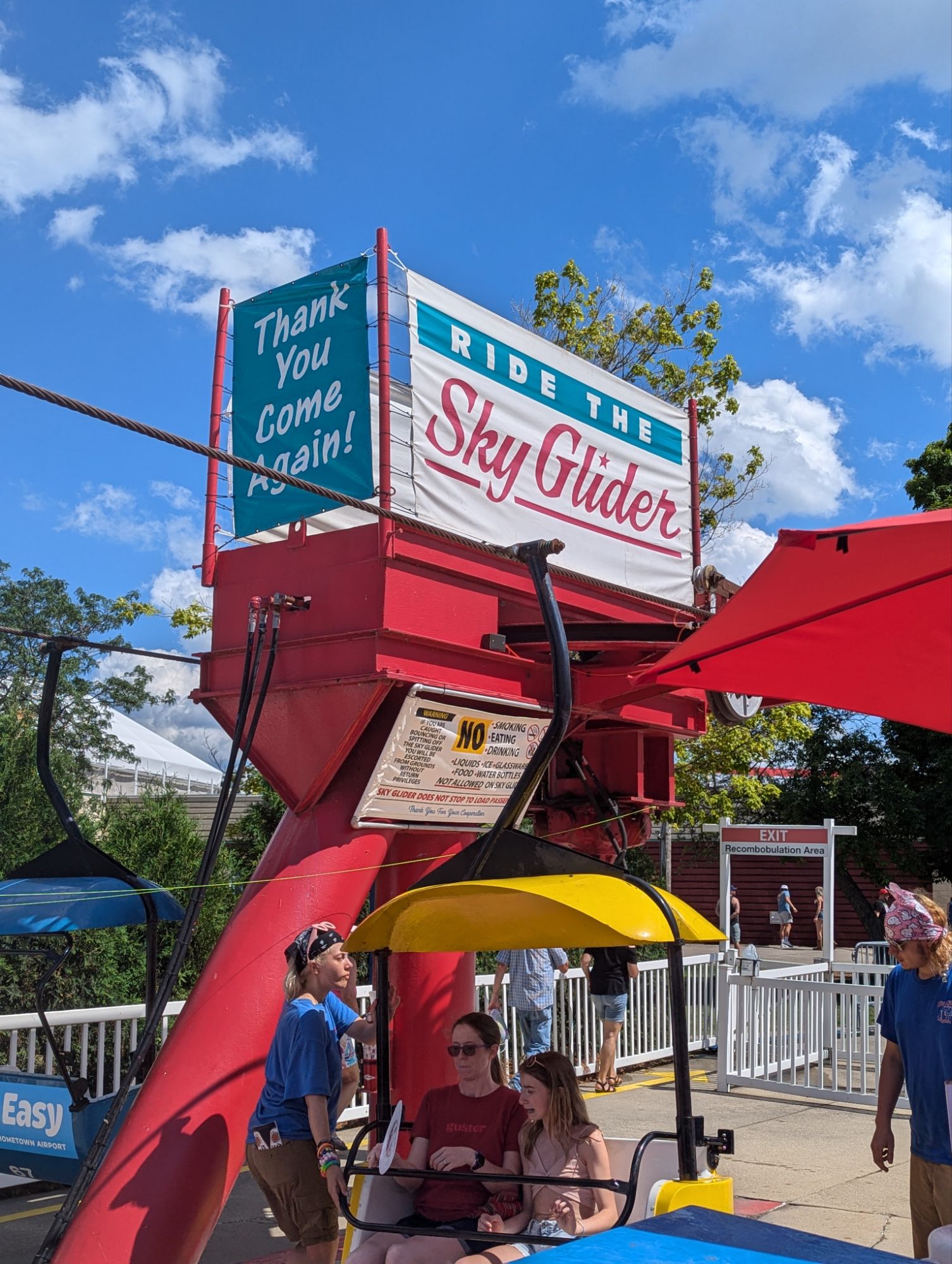 We got there around 3:00 and wandered around the grounds for a while, just to get the lay of the land. Much to my surprise, Tara suggested we take a ride on the Sky Glider for a birds-eye view. She doesn’t like heights and is prone to vertigo, so I didn’t expect her to want to do this. Immediately after take-off, she regretted that decision…