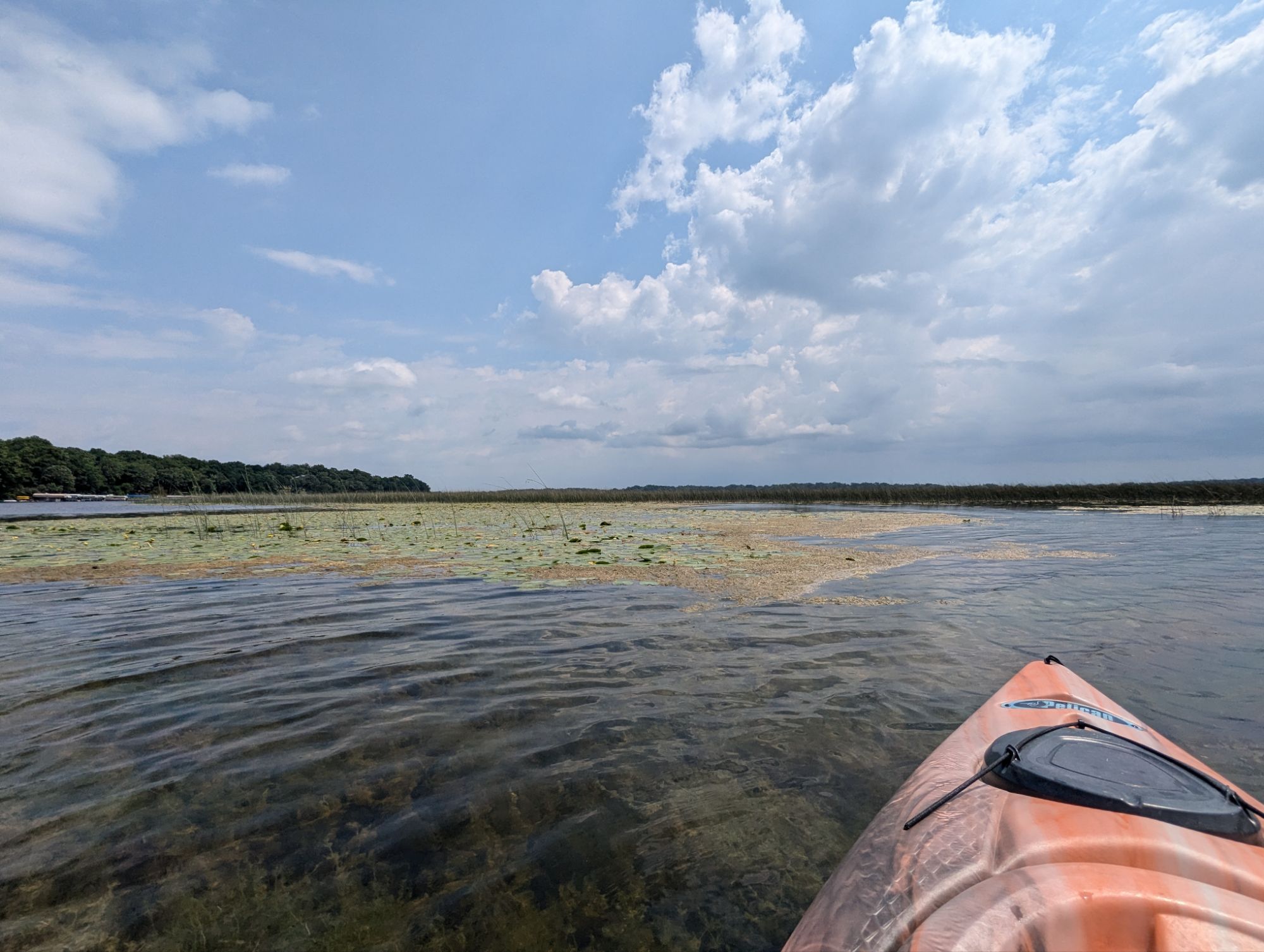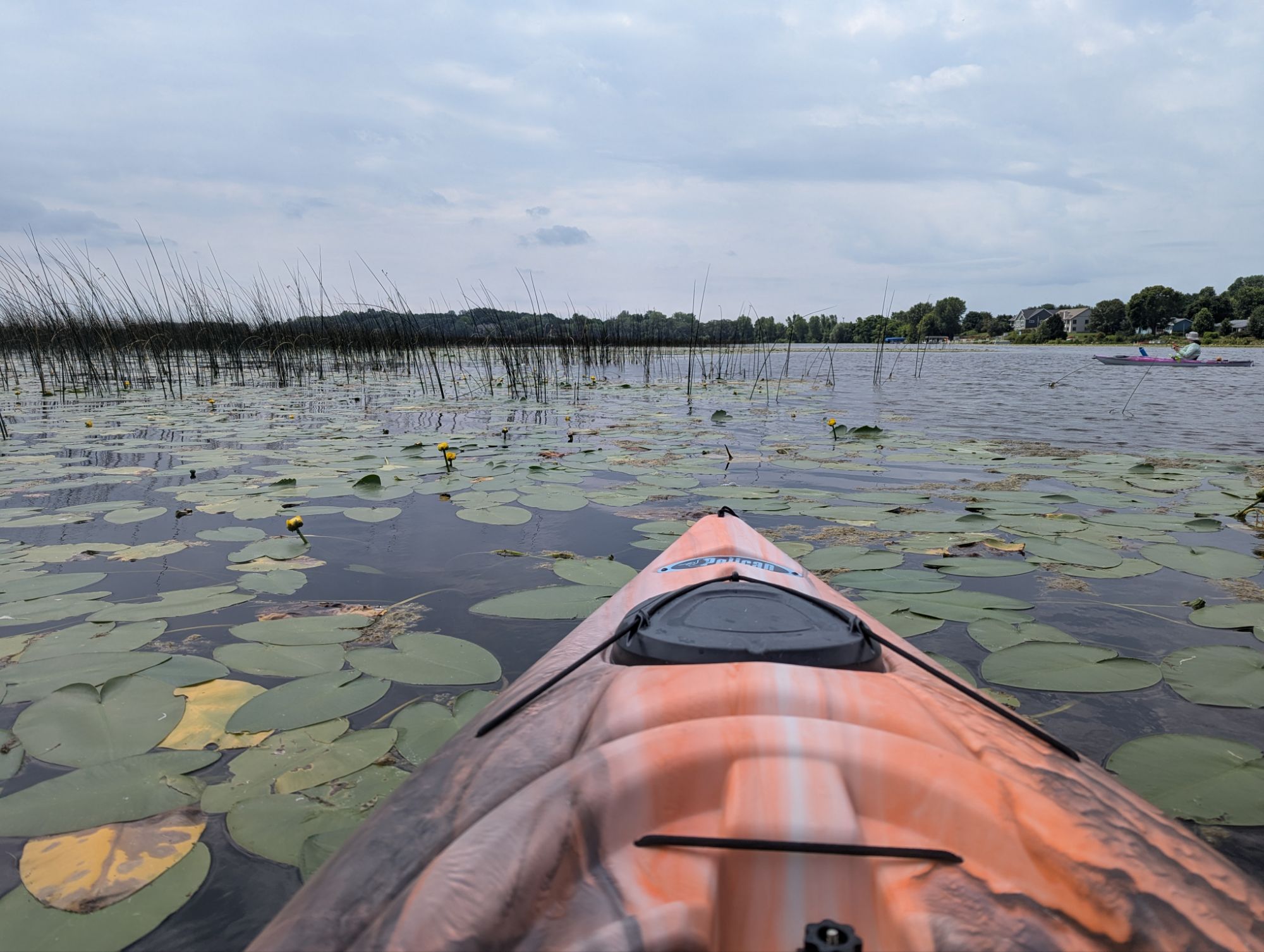 It was a hot and muggy day, and we hadn’t been kayaking in close to a year, so it felt great to get out on the water. But holy cow, we should have eased back in, because we traveled across 2/3 of the lake and were out there for almost three hours. Needless to say, we were pretty tired afterward.