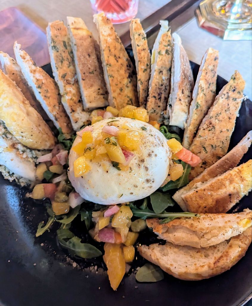 Guys, everything was fantastic. We started with an appetizer of burrata cheese, charred pepper-peach salsa, arugula, Coca-Cola gastrique, and garlic parmesan toast points. Geez Louise, that was mighty tasty!