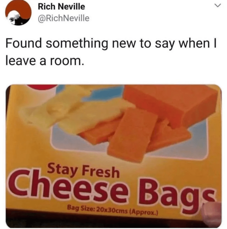 Sure enough, whenever I leave a get-together now, I’ll say, “Stay fresh, cheese bags!” It’s a great, casual way to make an exit. Sometimes I get a chuckle. And the best part of all?