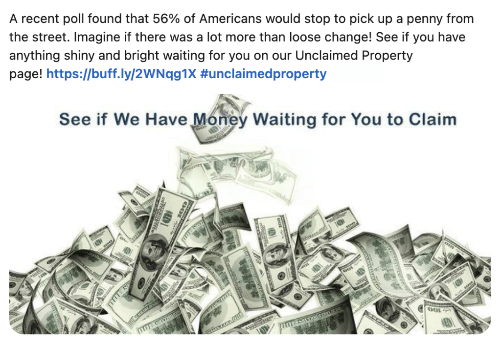 Wisconsin actually leads the nation in returning unclaimed property to its rightful owner. CheeseGov does a great job getting the word out, and actually won an award last year. We were even featured on Good Morning, America. Part of my job involves educating the general public that they might have untold riches awaiting them. Here are a couple of social media posts I put together to let folks know.