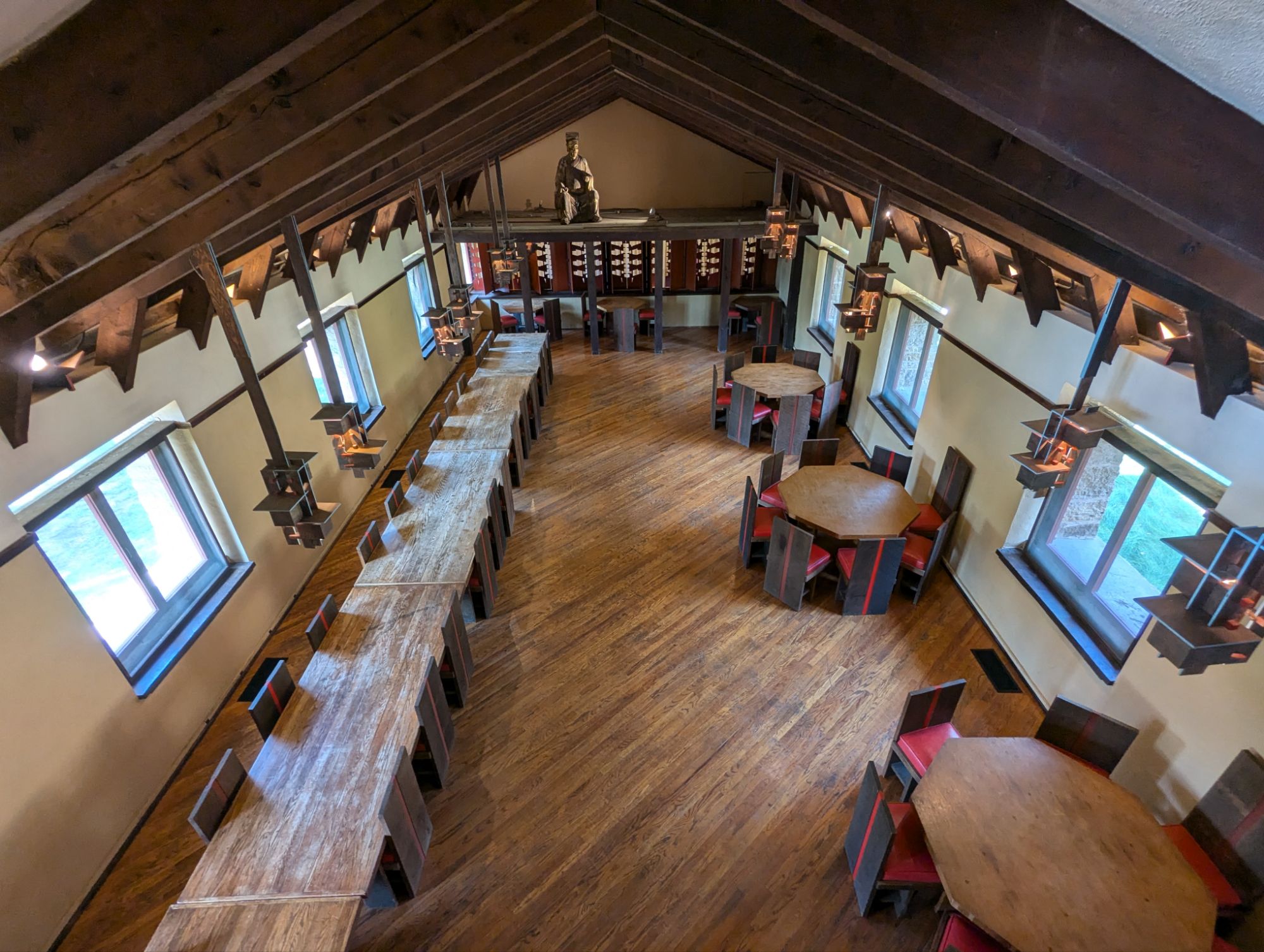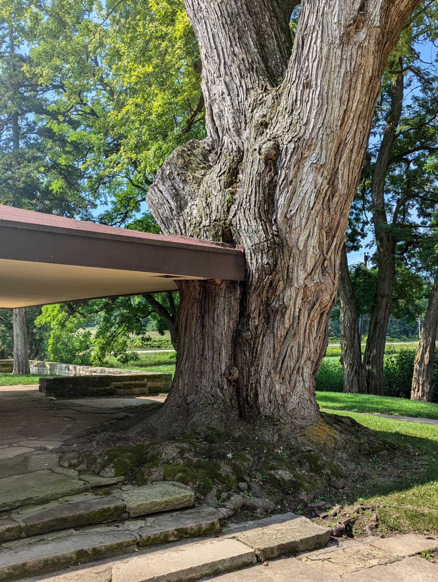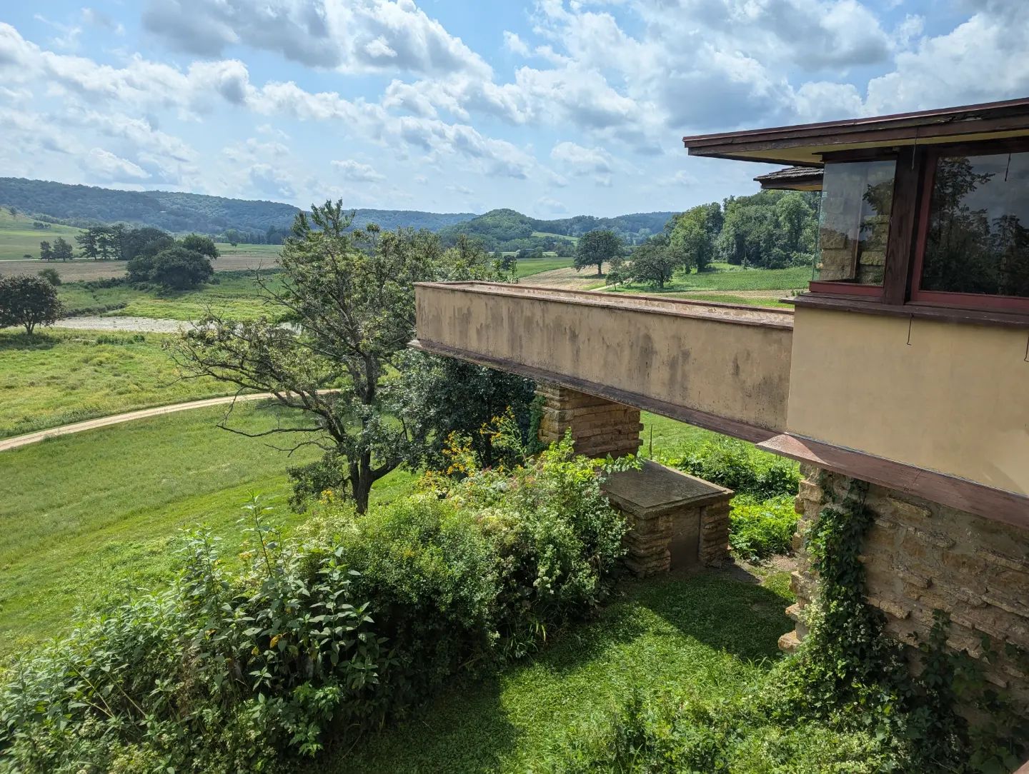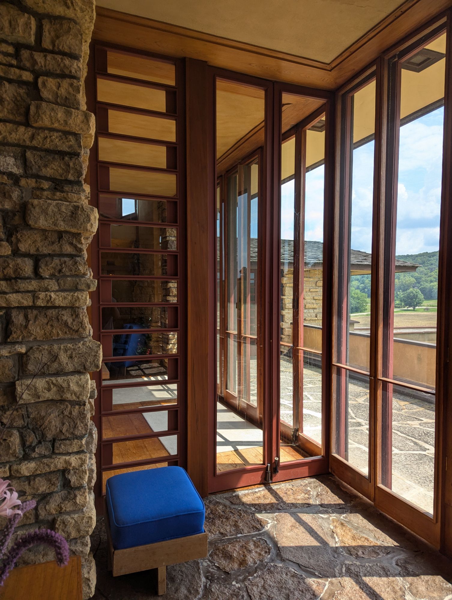 We opted for the Highlights Tour, which splits time between FLW’s architecture studio and home. My only regret was the fact that we were shuttled back and forth. Don’t get me wrong, I was thankful for an air-conditioned bus, but I would have preferred walking instead. We passed a bunch of other interesting buildings, like guest cottages and a farmhouse, that a tour bus only offered brief glimpses of. There actually is a longer, four-hour tour that takes you across the entire property on foot. Maybe we’ll do that one of these years. Preferably in the fall sometime, when the surrounding hills are ablaze with autumn color and the heat and humidity (and mosquitoes) are a distant memory.