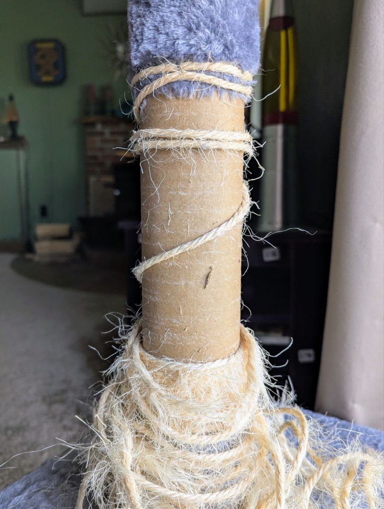 9. Our scratching post is rapidly decompsing… one of the tubes is nearly clawed through (about ⅓ of the side remains). Whenever I re-wrap a scratcher, I use glue so the midway bits stay adhered (plus I don’t want kitties pulling out staples).