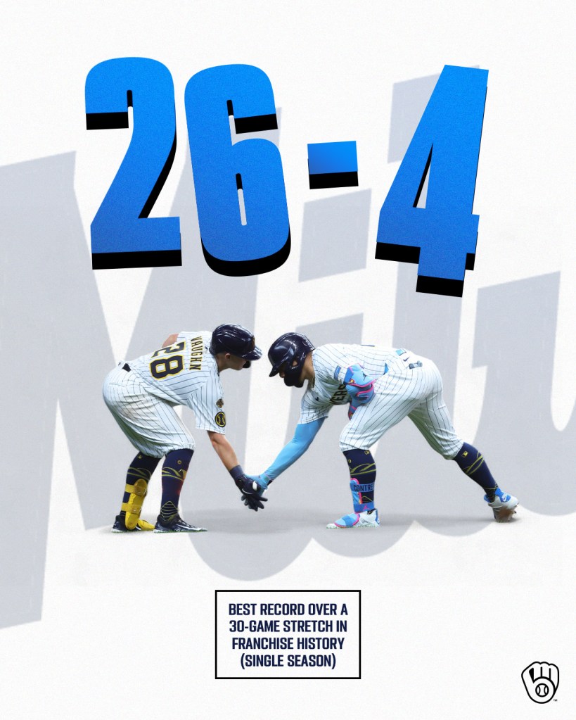 One thing I’ve seen a lot of in my recent hall walking: Milwaukee Brewers gear. Which technically goes against the CheeseGov dress code, but nobody’s cracking down on that. Can’t say I blame ’em. These guys are scorching hot right now! They have the best record in the major leagues, have won 12 straight games, swept four consecutive series, and are the first National League team since the 1935 Cubs to have multiple 11+ game winning streaks in a single season. Everything about this year feels historic.