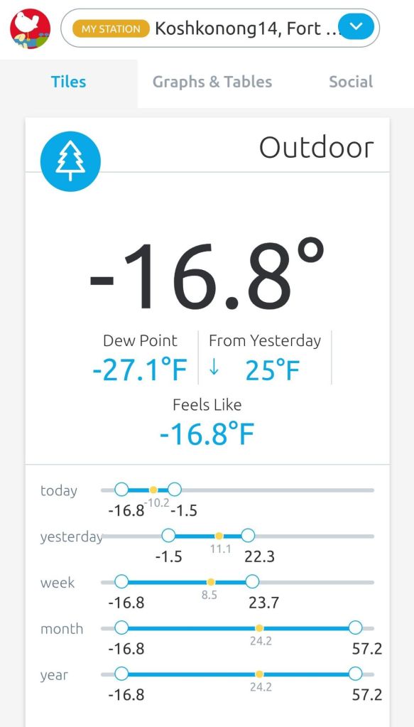 That’s chilly, even for us. And my weather station doesn’t really pick up wind, so even though the “Feels Like” temp showed the same, the actual wind chill according to the National Weather Service was -40°. Can’t say I’ve experienced that often. Or, umm, ever. It’s 1:30 in the afternoon and still -9°. Hence the Extreme Cold Warnings and school closures and pop-up warming shelters.