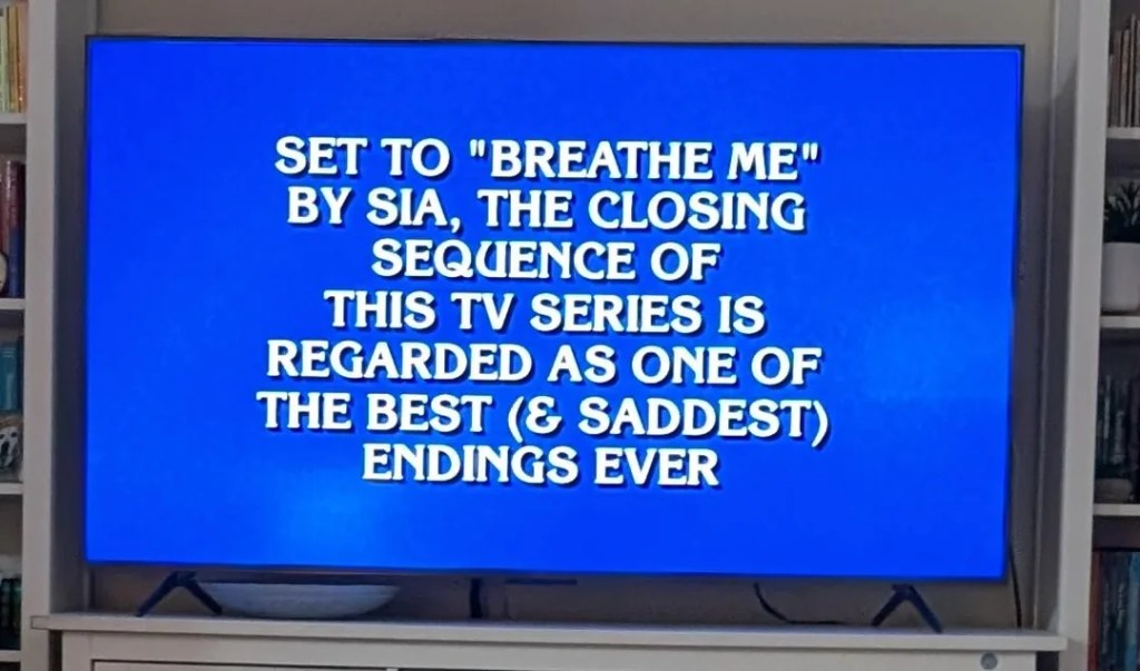 1. I could read through the spoiler because I did watch all of Six Feet Under (my sons turned me on to it when it came out). What are the chances Jeopardy could send you the message right at this time? I think AI may have already taken over your television set and is messing with you.
