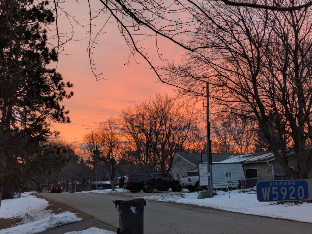 “Ooh, there’s some nice color in the sky,” Tara announced this morning, a few minutes before 7:00. I glanced out the window and saw she was right, so I grabbed my phone, dashed outside, and snapped a pic. I didn’t even throw on a coat or shoes despite the 23-degree chill (which is actually a helluva lot warmer than it has been).