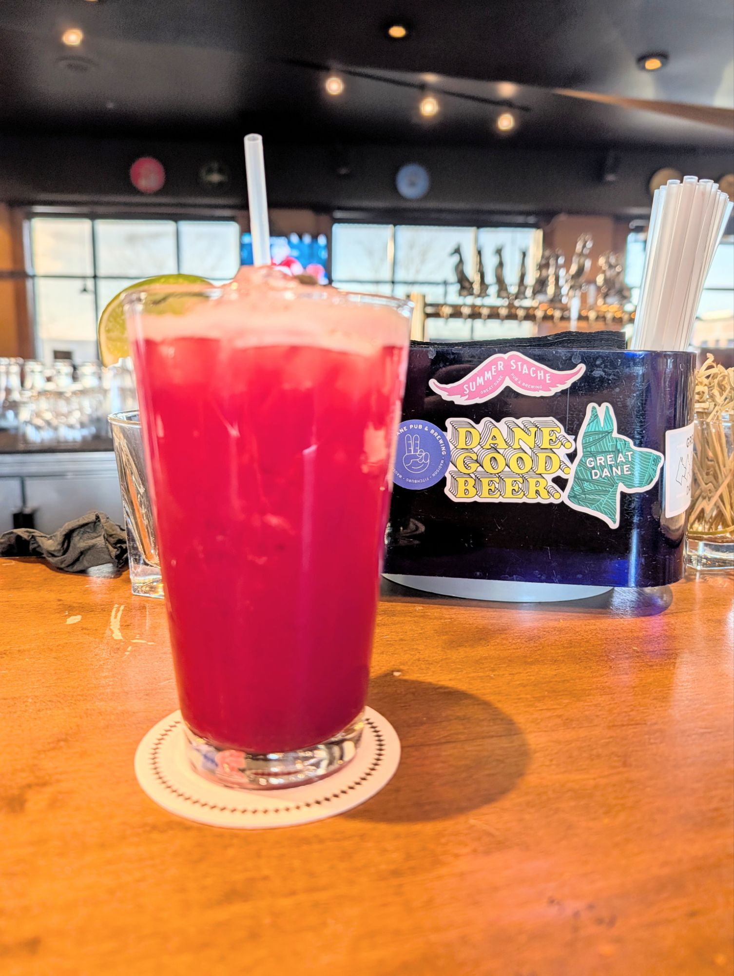 How was your V-Day? We don’t celebrate, but just happened to find ourselves out for dinner and drinks. We’d gone into Madison for PBS Wisconsin’s Garden & Green Living Expo at the Alliant Energy Center. Seeds and starts and manure? That’s like porn to Tara. Afterward, we decided to check out the Eastside Great Dane Pub & Brewing. We’d only ever been to their flagship spot downtown, and while this one was smaller, it had floor-to-ceiling glass windows overlooking the city and we were able to belly right up to the bar without muscling our way through a crowd of people. Tara ordered a beer and I chose a Dark Cherry Margarita that was tart, tangy, and delicious. Tara took one sip and said to hell with the beer, ordering herself one-a them there margs.