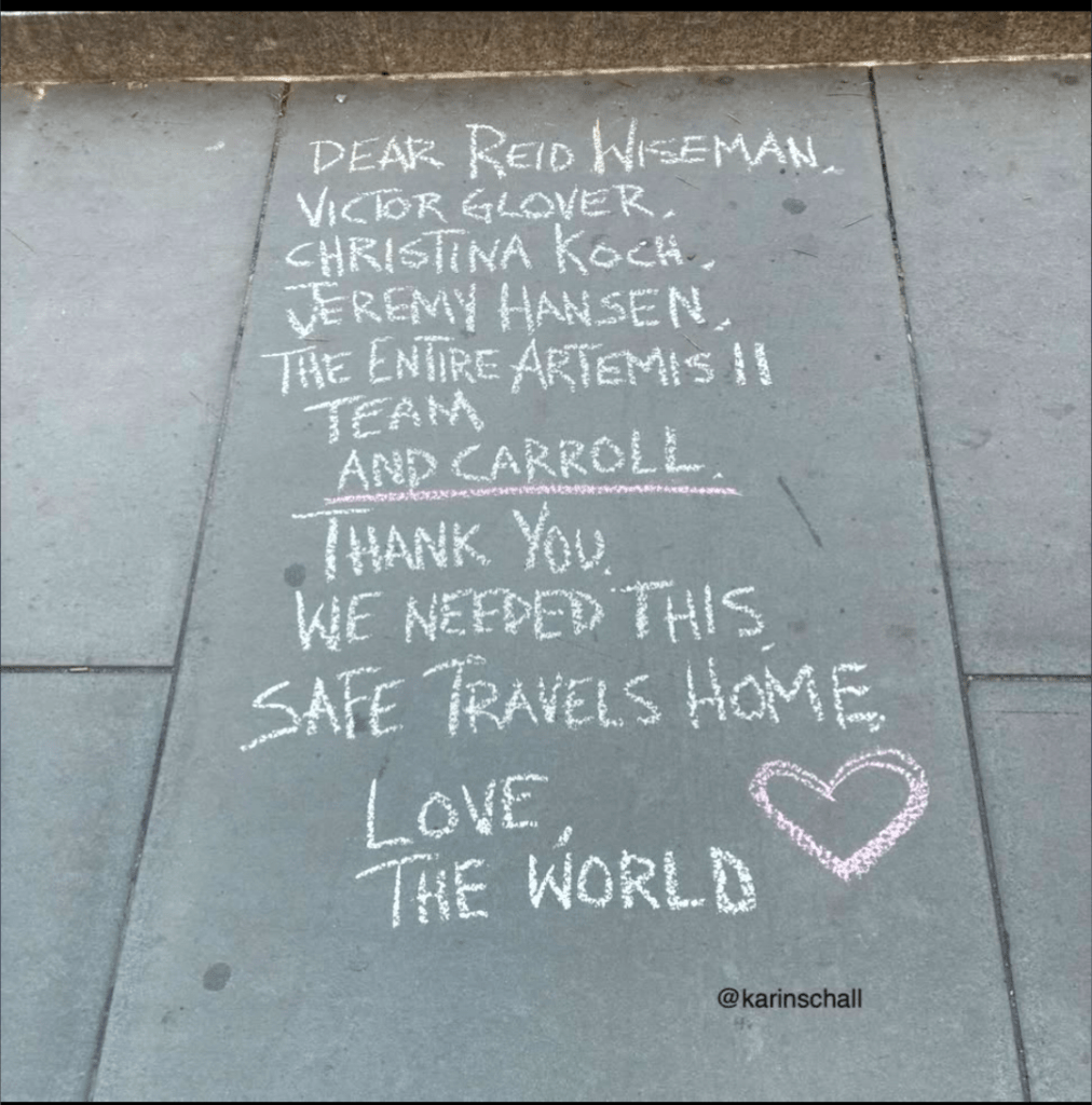 Artemis II, it turns out, is exactly the emotional balm I needed. A salve for the wounds inflicted by our batshit crazy president. What a week, huh? Reliving the Challenger explosion and The Day After was giving me peak Gen X flashbacks.