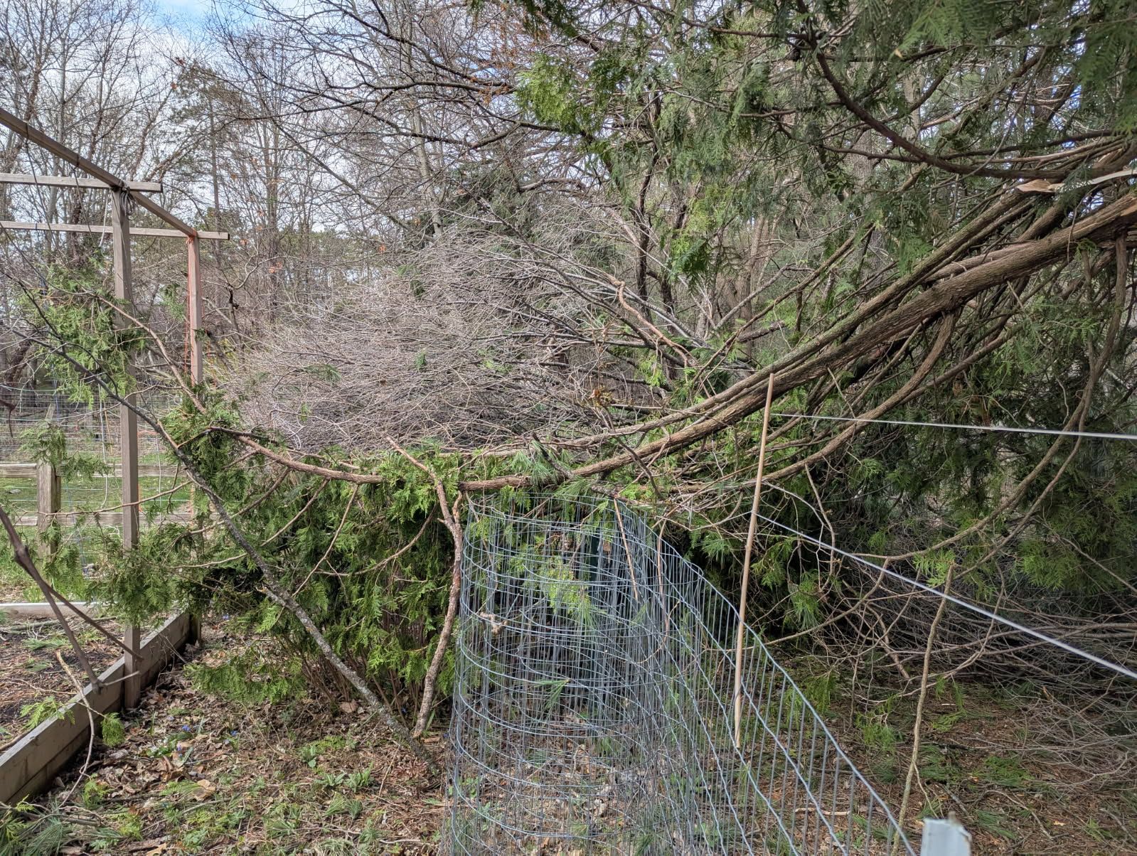 Thankfully, the tree missed Tara’s garden beds (but barely). She says the fence is salvageable. We’ll just have to bust out the chainsaw when I’m back.